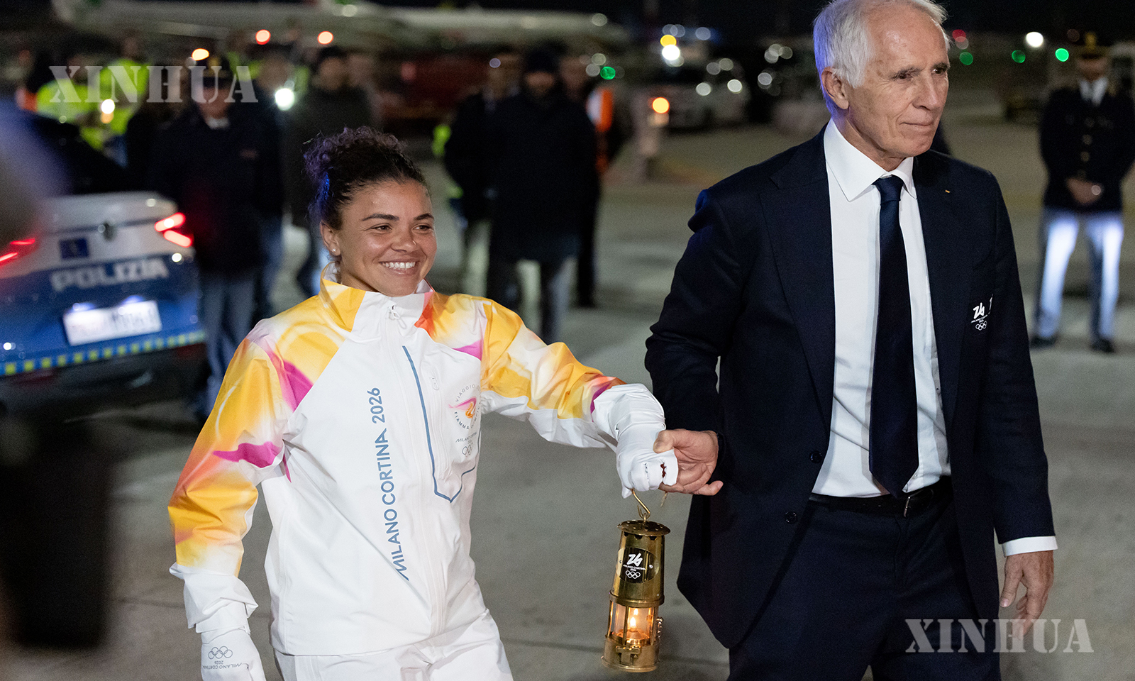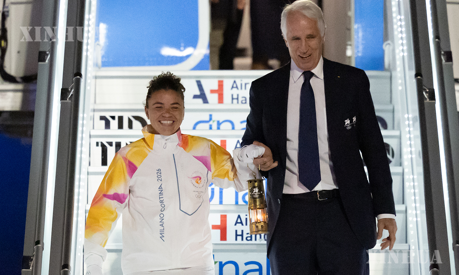 图说:12月4日,在意大利罗马菲乌米奇诺机场,意大利网球奥运冠军保利尼(左)与米兰冬奥会组委会主席、意大利奥委会主席乔瓦尼·马拉戈携火种灯走下舷梯。 新华社记者 李京 摄