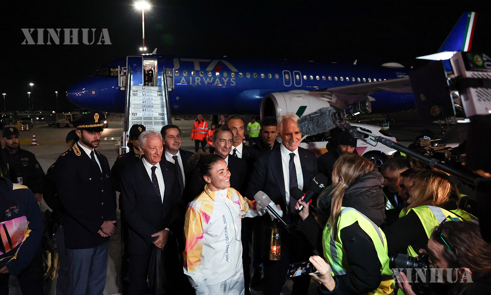 当地时间12月4日下午,搭载2026年米兰-科尔蒂纳冬奥会火种的航班从雅典抵达意大利罗马菲乌米奇诺机场。