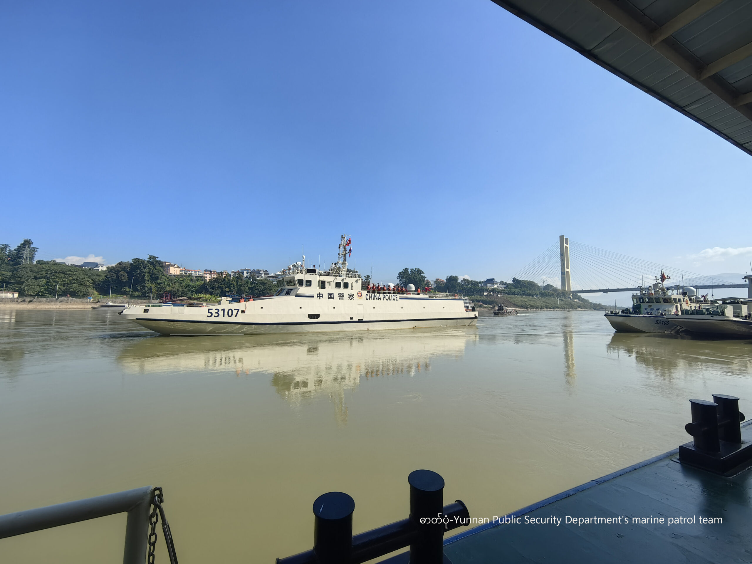တရုတ်နိုင်ငံ ယူနန်ပြည်နယ် ရှစ်ဆောင်ပဏ္ဏား တိုင်လူမျိုး ကိုယ်ပိုင်အုပ်ချုပ်ခွင့်ရပြည်နယ်ခွဲ ကျင်ဟားရဲတပ်ဖွဲ့ဆိပ်ကမ်းသို့ တဖြည်းဖြည်းဆိုက်ကပ်နေသည့် တရုတ်ဘက် ၅၃၁၀၇ ရေယာဉ်ကို ၂၀၂၅ ခုနှစ် ဒီဇင်ဘာ ၅ ရက်က တွေ့ရစဉ် (ဓာတ်ပုံ-Yunnan Public Security Department's marine patrol team)