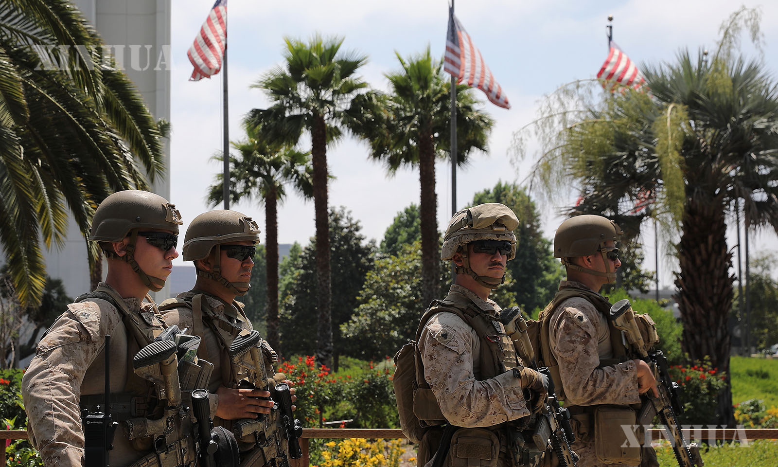 图说:6月13日,美国海军陆战队士兵在洛杉矶威尔希尔联邦大楼的入口处站岗。新华社发(邱晨摄)