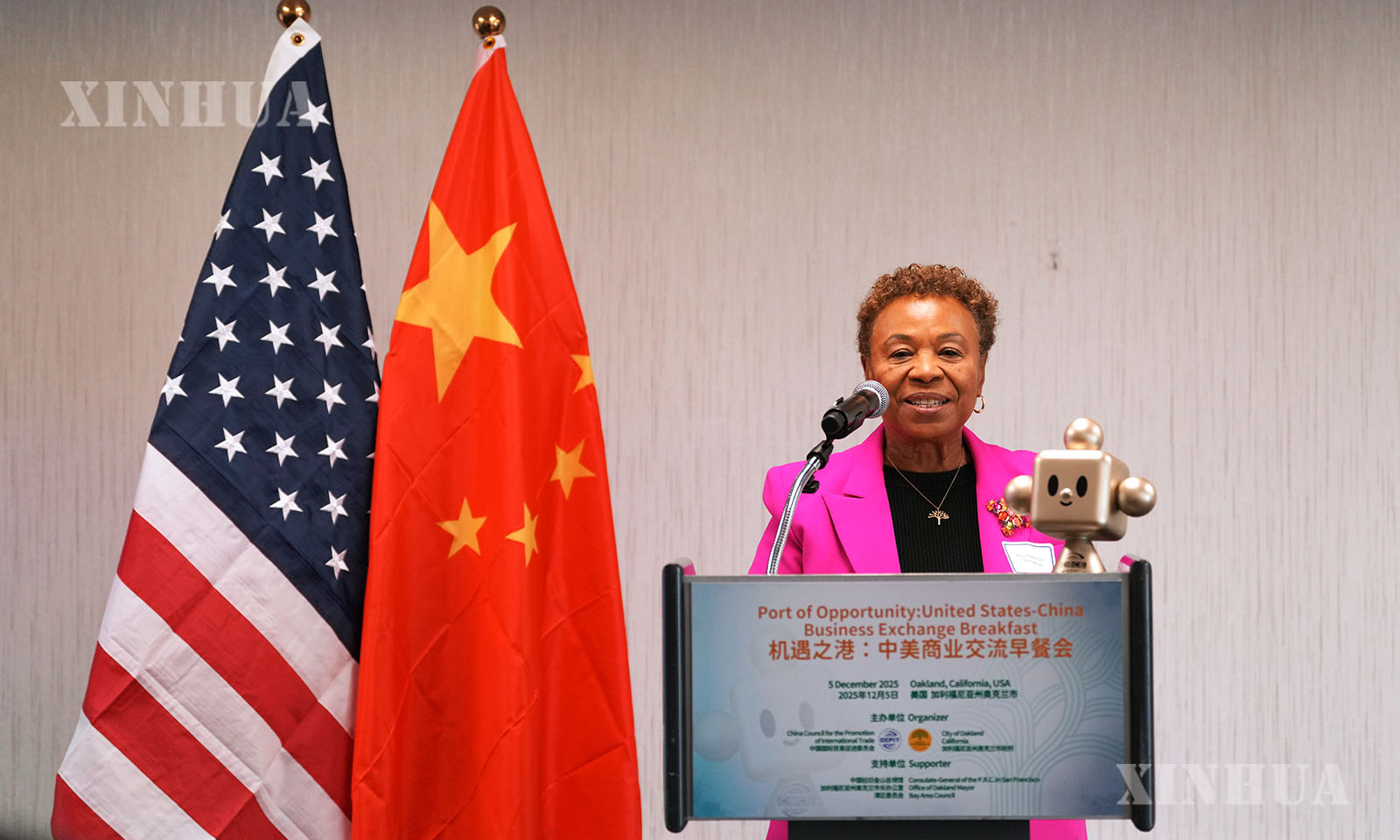 အမေရိကန်နိုင်ငံ ကယ်လီဖိုးနီးယားပြည်နယ် အော်ကလန်မြို့၌ အော်ကလန်မြို့တော်ဝန် Babara Lee က အမှာစကားပြောကြားနေသည်ကို ၂၀၂၅ ခုနှစ် ဒီဇင်ဘာ ၅ ရက်က တွေ့ရစဉ် (ဆင်ဟွာ)