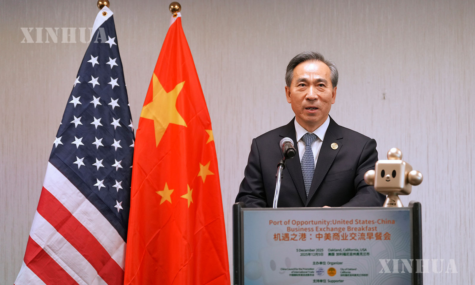 အမေရိကန်နိုင်ငံ ကယ်လီဖိုးနီးယားပြည်နယ် အော်ကလန်မြို့၌ တရုတ်နိုင်ငံ နိုင်ငံတကာကုန်သွယ်မှုမြှင့်တင်ရေးကောင်စီ (CCPIT) ဥက္ကဋ္ဌ ရန့်ဟုန်ပင်းက အမှာစကားပြောကြားနေသည်ကို ၂၀၂၅ ခုနှစ် ဒီဇင်ဘာ ၅ ရက်က တွေ့ရစဉ် (ဆင်ဟွာ)