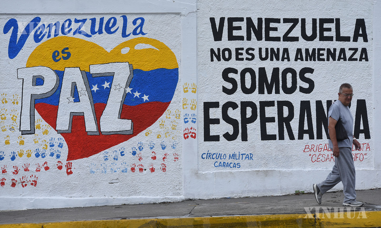 ဗင်နီဇွဲလားနိုင်ငံ မြို့တော်ကရာကတ်စ်တွင် “ဗင်နီဇွဲလားက ငြိမ်းချမ်းသောနိုင်ငံဖြစ်သည်”၊ “ဗင်နီဇွဲလားနိုင်ငံက ခြိမ်းခြောက်မှုမဟုတ်ဘဲ မျှော်လင့်ချက်ဖြစ်သည်” ဟူသော ဆောင်ပုဒ်များရေးသားထားသော လမ်းမထက်တွင် လမ်းလျှောက်သွားသူကို စက်တင်ဘာ ၂၂ ရက်က တွေ့ရစဉ် (ဆင်ဟွာ)