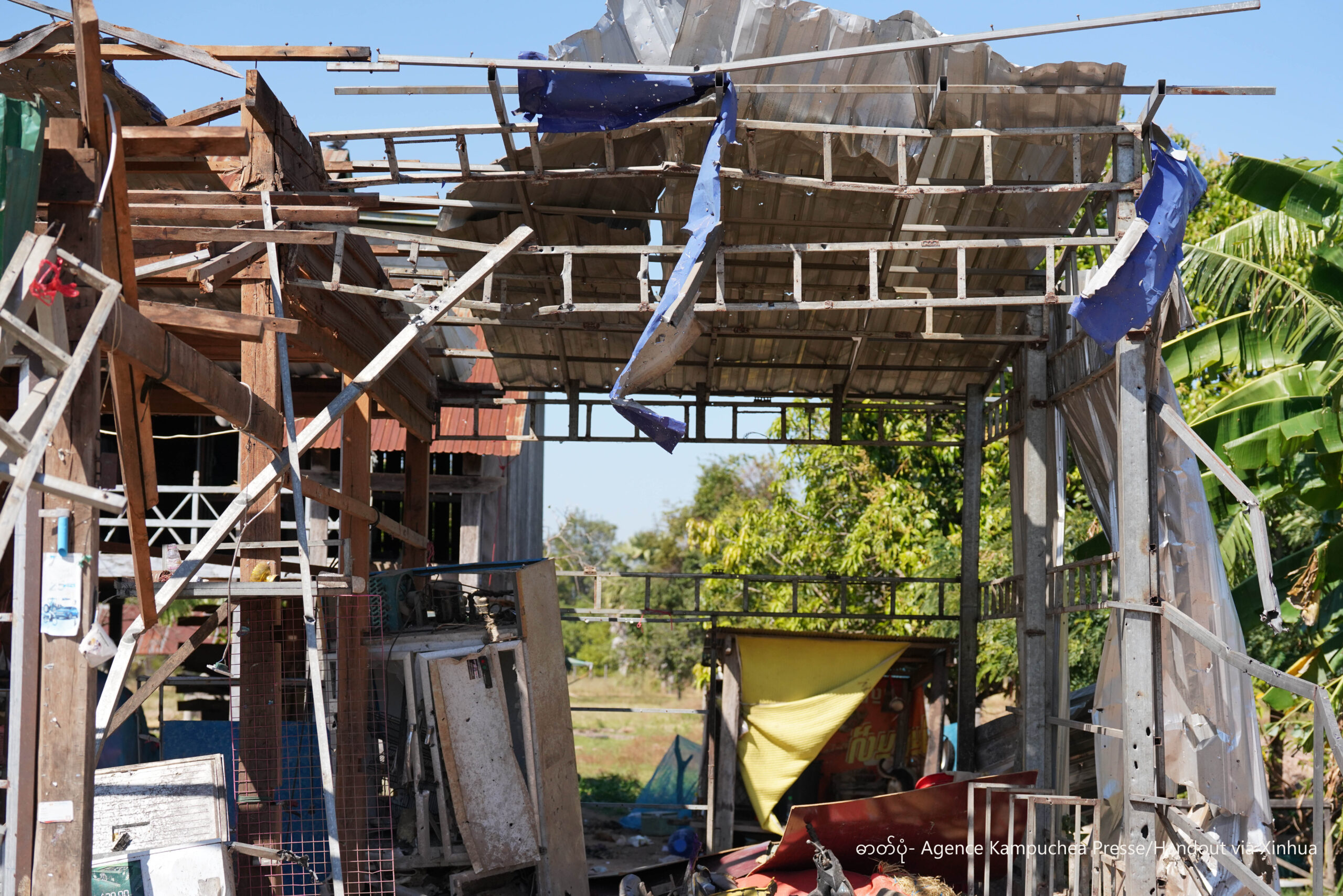 ကမ္ဘောဒီးယားနိုင်ငံ Oddar Meanchey ပြည်နယ်တွင် ပဋိပက္ခအတွင်း ပျက်စီးသွားသော နေအိမ်အား ၂၀၂၅ ခုနှစ် ဒီဇင်ဘာ ၂၀ ရက်က တွေ့ရစဉ် (ဓာတ်ပုံ- Agence Kampuchea Presse/Handout via Xinhua)