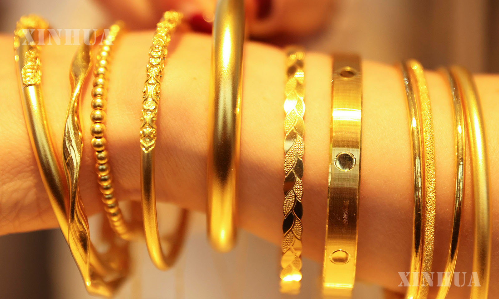 图说:2月11日,在浙江省湖州市德清县乾元镇一家金店,店员展示黄金首饰。新华社发(倪立芳摄)