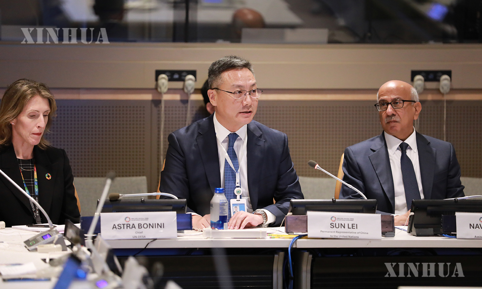 图说:7月16日,在位于纽约的联合国总部,中国常驻联合国副代表孙磊(中)在“2025全球可持续交通最佳实践案例集”发布活动上致辞。新华社记者 谢锷 摄