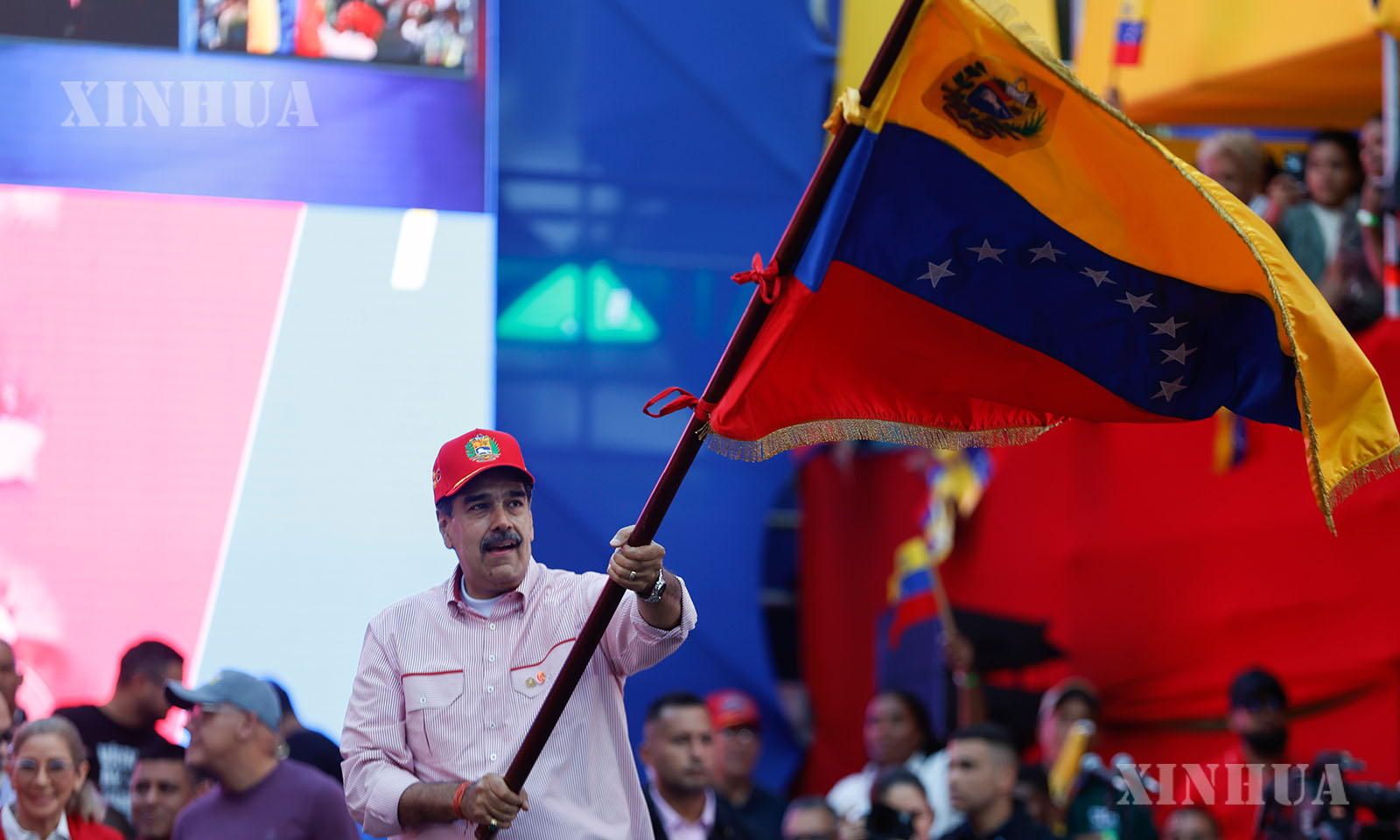 ဗင်နီဇွဲလားနိုင်ငံ သမ္မတ မာဒူရိုက ဗင်နီဇွဲလားနိုင်ငံ မြို့တော် ကရာကတ်စ် ဆန္ဒပြလှုပ်ရှားမှုအတွင်း နိုင်ငံတော်အလံအား ဝှေ့ယမ်းနေသည်ကို ၂၀၂၅ ခုနှစ် ဒီဇင်ဘာ ၁ ရက်က တွေ့ရစဉ် (ဆင်ဟွာ)