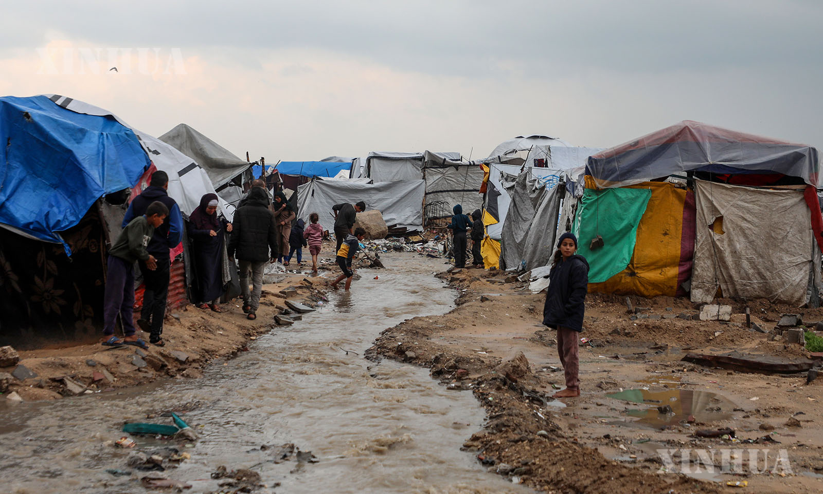 ဂါဇာမြို့ ယာယီနေထိုင်ရာ မိုးကာတဲအပြင်ဘက်တွင် ပါလက်စတိုင်းသားများအား ဒီဇင်ဘာ ၁၂ ရက်က တွေ့ရစဉ် (ဆင်ဟွာ)