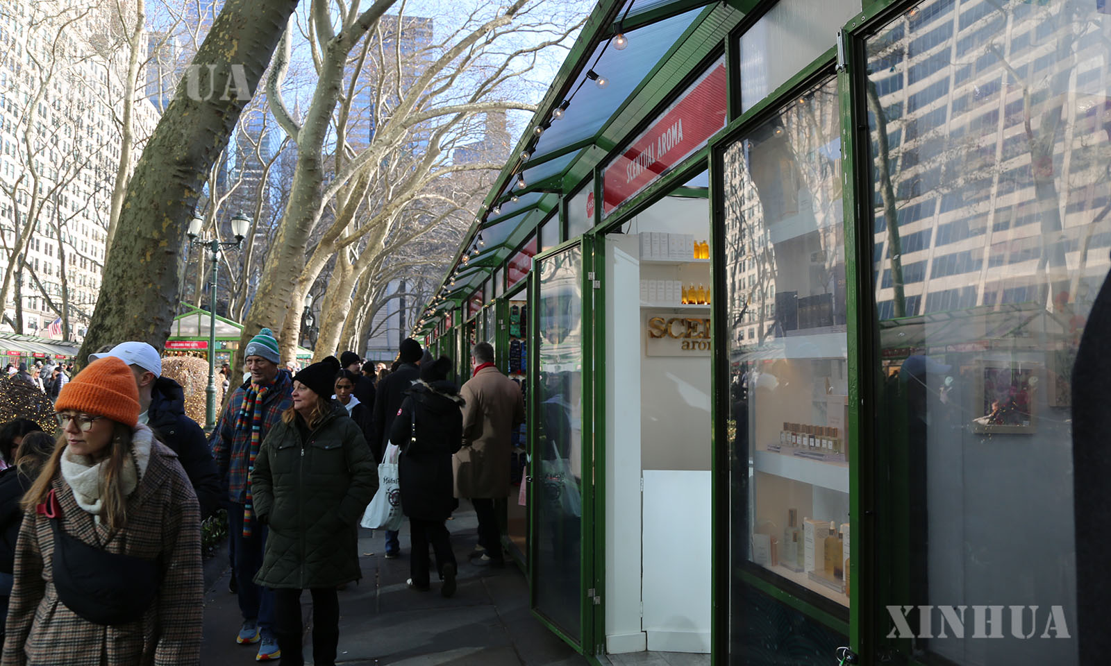 အမေရိကန် နယူးယောက်မြို့ Manhattan ရှိ Bryant ပန်းခြံ၌ ပြုလုပ်သော ပွဲတော်ရက် ပွဲဈေးတန်းတွင် လည်ပတ်နေကြသူများအား ၂၀၂၅ ခုနှစ် ဒီဇင်ဘာ ၂၂ ရက်က တွေ့ရစဉ် (ဆင်ဟွာ)