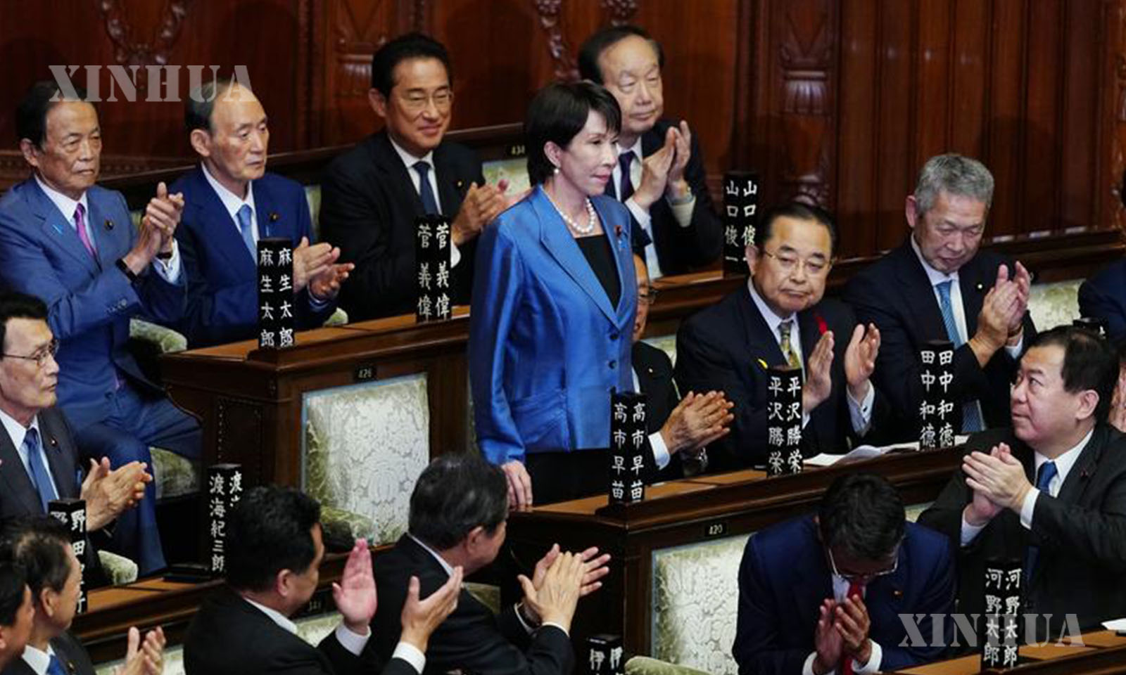 1. 2025年10月21日,在日本东京,自民党总裁高市早苗(中)在临时国会众议院首相指名选举中胜出后起身致谢。新华社记者 贾浩成 摄