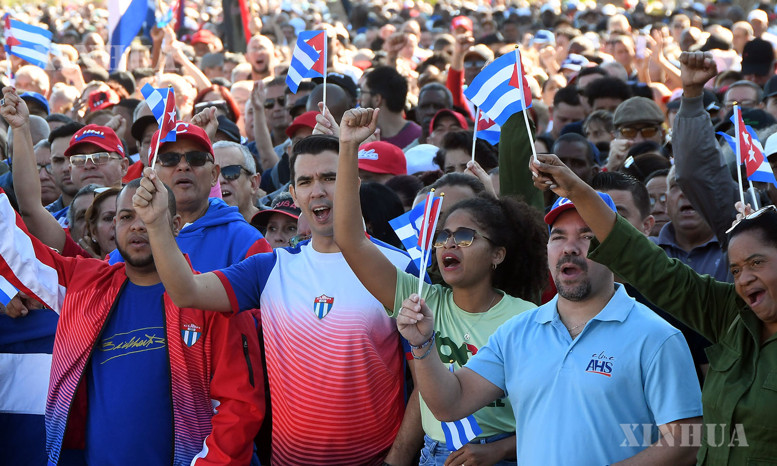 图说:1月3日,在古巴首都哈瓦那,民众参加集会活动谴责美国军事入侵委内瑞拉。新华社发(华金·埃尔南德斯摄)