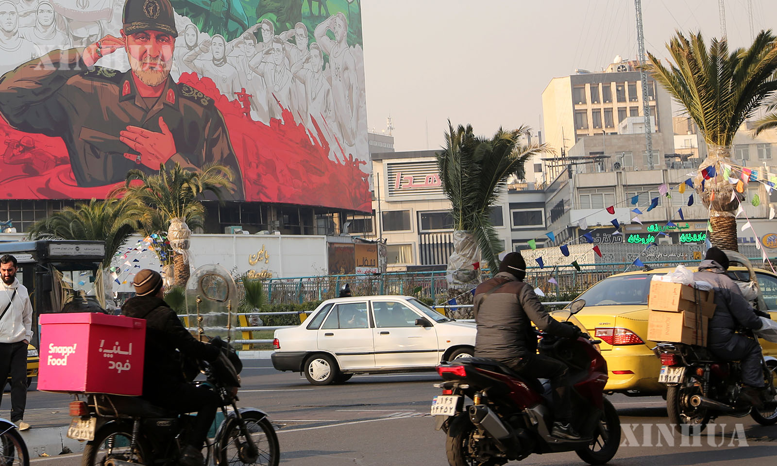 အီရန်နိုင်ငံ မြို့တော် တီဟီရန် လမ်းမထက်တွင် လုပ်ကြံခံရ၍ သေဆုံးခဲ့ရသော အီရန်အဆင့်မြင့် ဗိုလ်ချုပ်ကြီး Qassem Soleimani ရုပ်ပုံရေးဆွဲထားသော ကြေငြာဘုတ်ရှေ့မှ ဖြတ်သွားသော မော်တော်ကားများအား ၂၀၂၆ ခုနှစ် ဇန်နဝါရီ ၆ ရက်က တွေ့ရစဉ် (ဆင်ဟွာ)