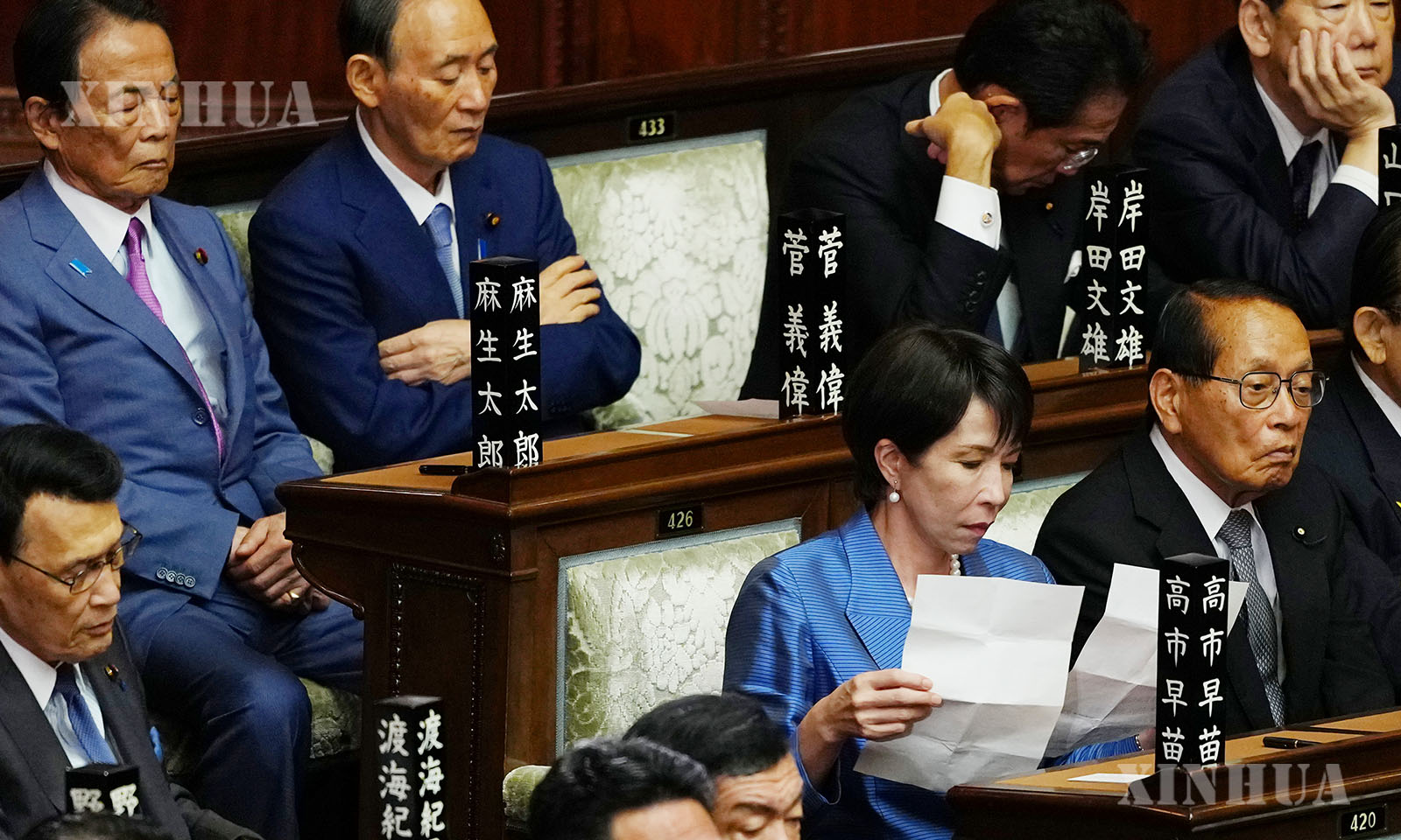 图说:2025年10月21日,在日本东京,自民党总裁高市早苗(前排右二)在临时国会众议院首相指名选举现场阅读文件。新华社记者 贾浩成 摄
