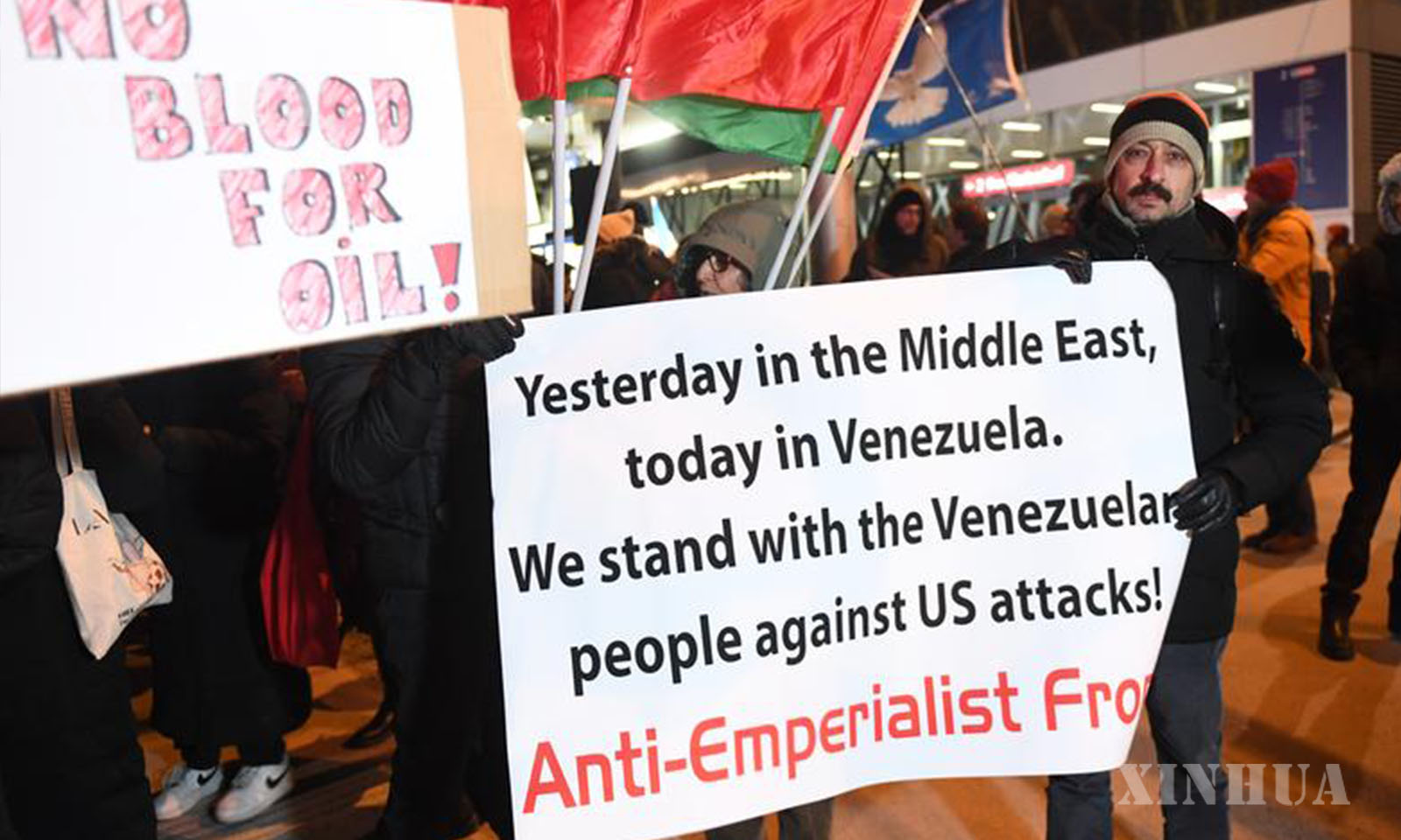 2. 1月8日,人们在奥地利维也纳抗议美国对委内瑞拉发动军事打击。 新华社记者 贺灿铃 摄