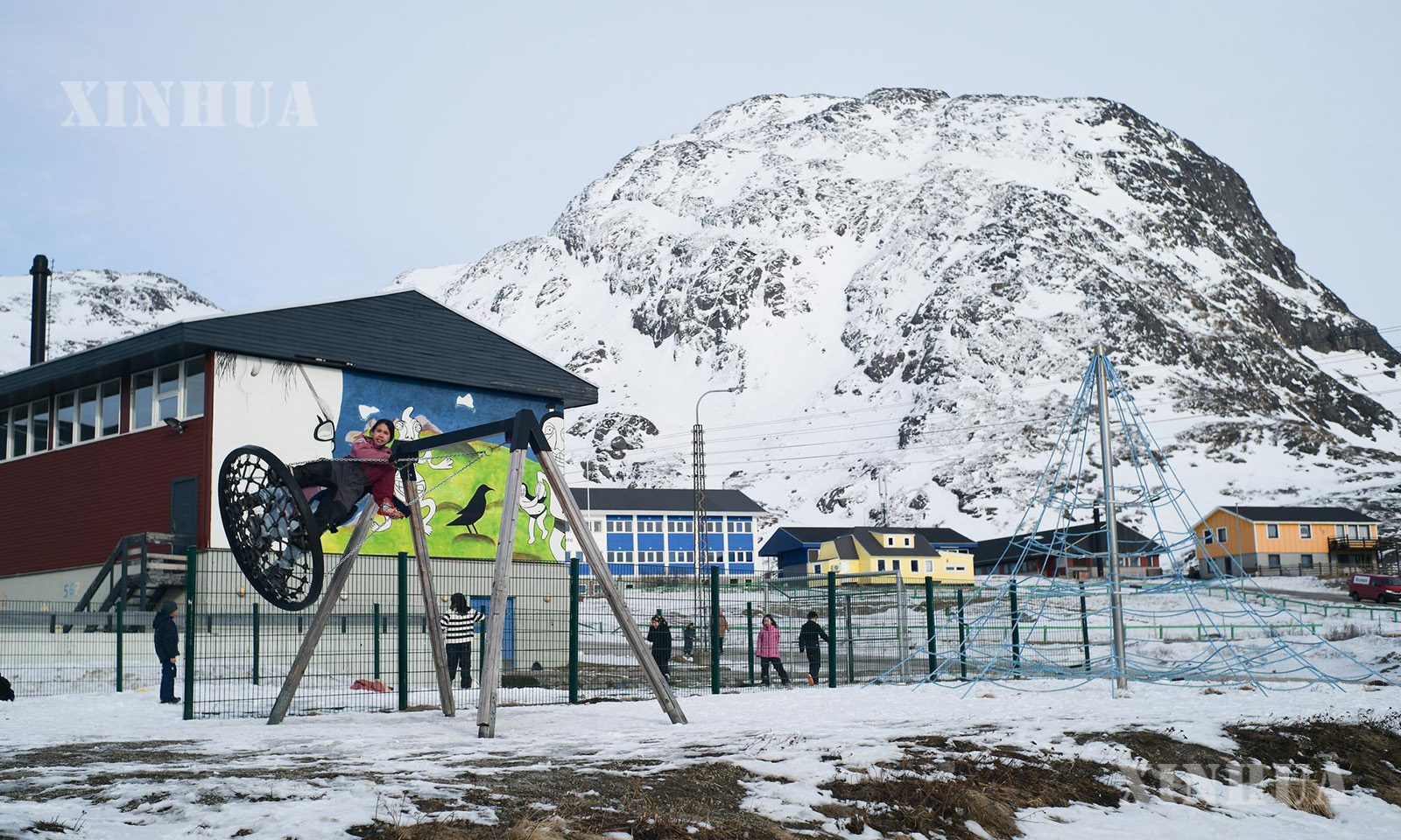 图说:2025年3月21日,在丹麦自治领地格陵兰岛纳尔萨克,孩子们在路边玩耍。新华社记者彭子洋摄
