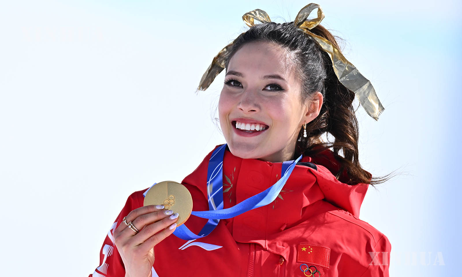 1、2月22日,冠军中国选手谷爱凌在颁奖仪式上。 新华社记者 张宏祥 摄