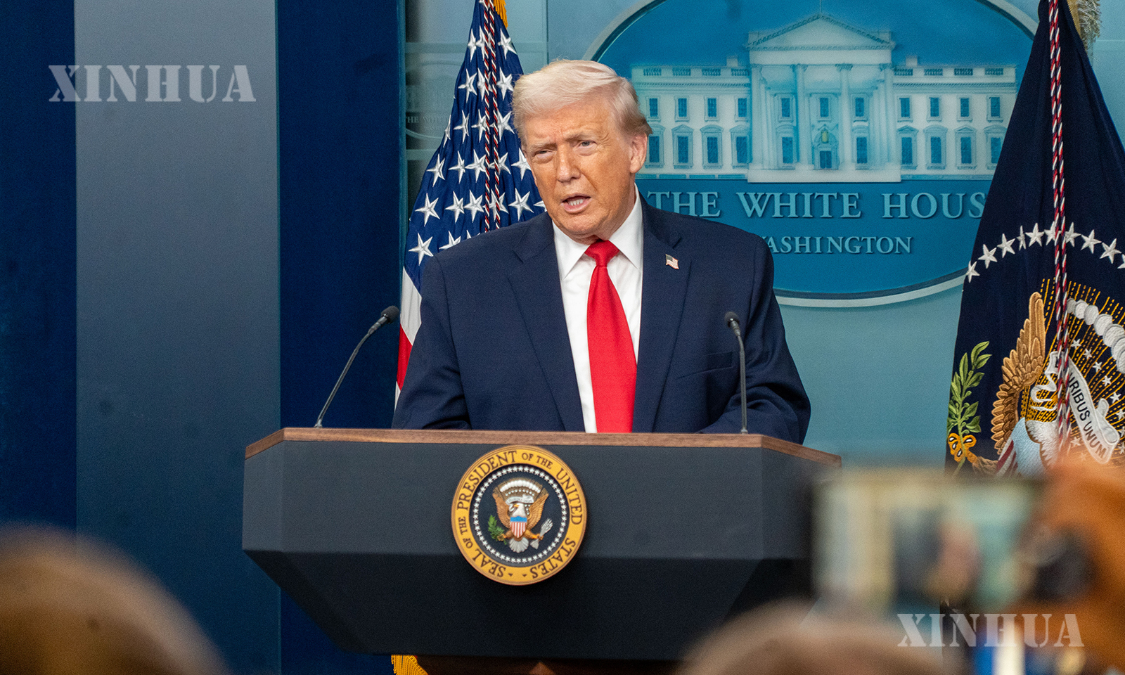 图说:1月20日,在美国首都华盛顿白宫,美国总统特朗普出席记者会。新华社发(李源清摄)