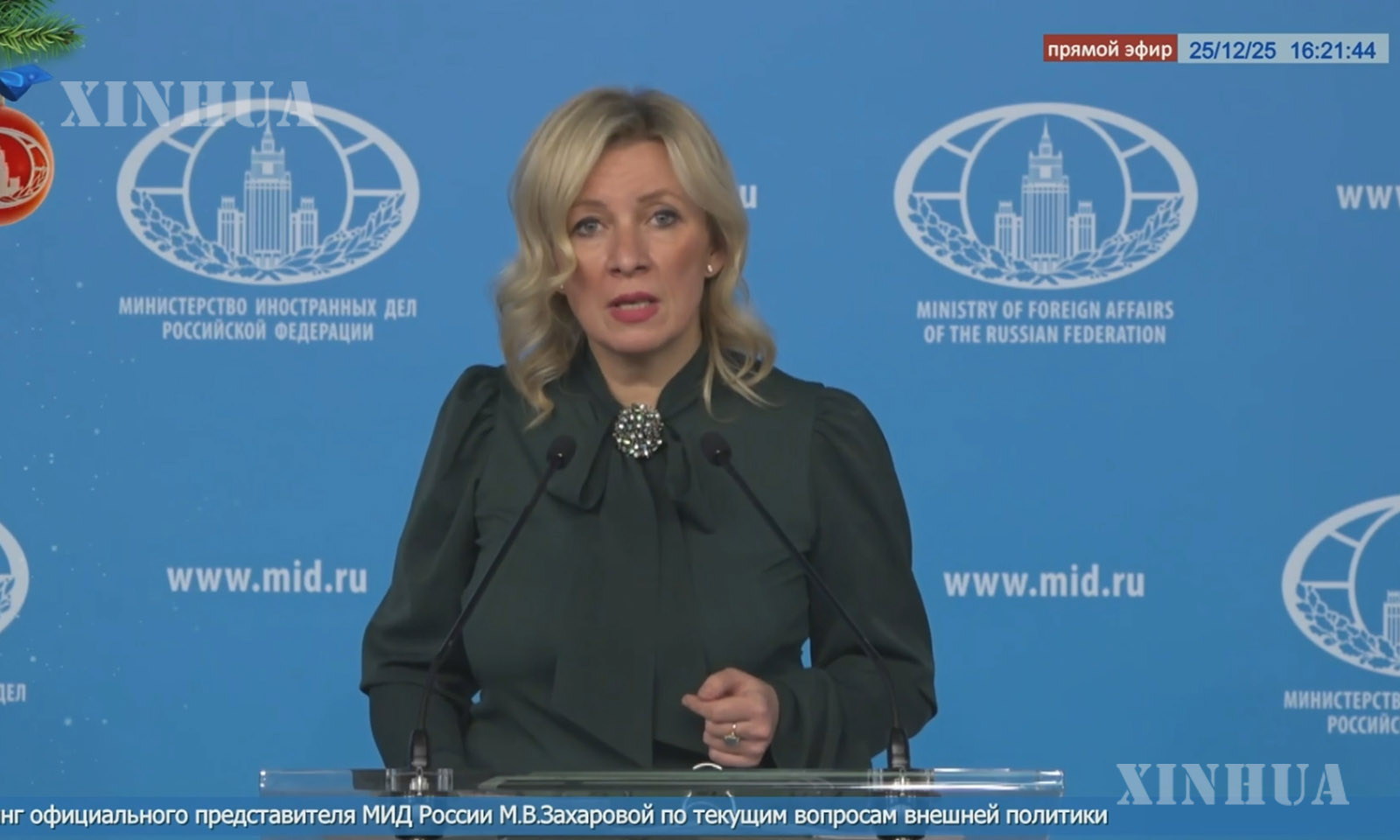 图说:这张视频截图显示,2025年12月25日,俄罗斯外交部发言人扎哈罗娃在莫斯科举行的外交部例行记者会上讲话。新华社发