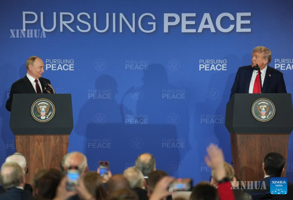 1. 2025年8月15日,美国总统特朗普(右)与俄罗斯总统普京在美国阿拉斯加州安克雷奇市埃尔门多夫-理查森联合军事基地举行会晤后共同出席联合记者会。 新华社记者 吴晓凌 摄