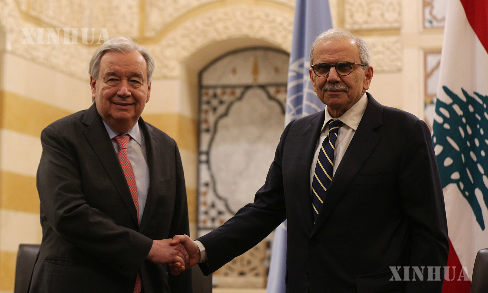 图说:3月13日,在黎巴嫩首都贝鲁特,黎巴嫩总理萨拉姆(右)欢迎联合国秘书长古特雷斯访问黎巴嫩。新华社发(比拉尔·贾维希摄)