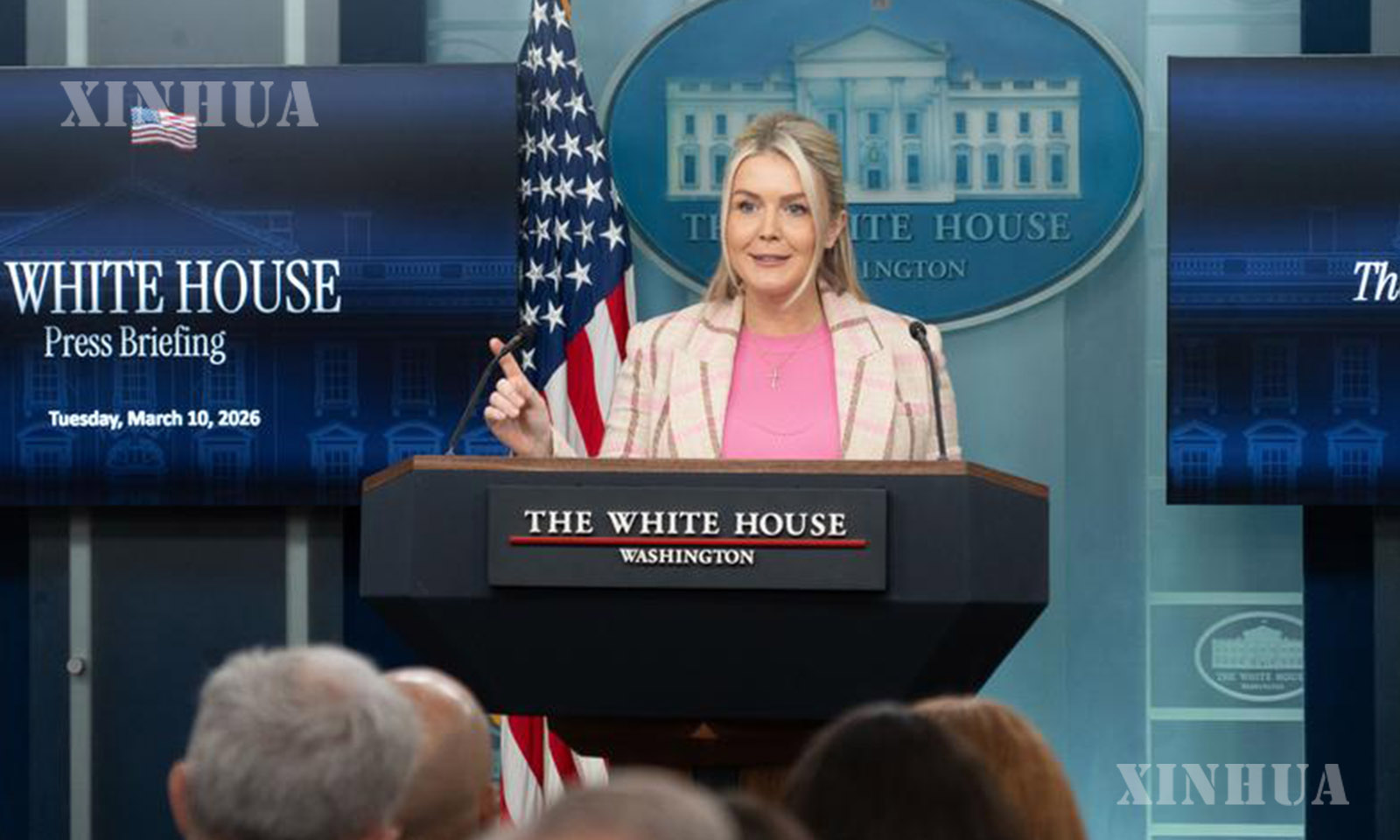 အမေရိကန်နိုင်ငံ မြို့တော် ဝါရှင်တန်တွင် အိမ်ဖြူတော်ပြောရေးဆိုခွင့်ရှိသူ Karoline Leavitt သတင်းစာရှင်းလင်းပွဲတက်ရောက်နေသည်ကို ၂၀၂၆ ခုနှစ် မတ် ၁၀ ရက်က တွေ့ရစဉ် (ဆင်ဟွာ)