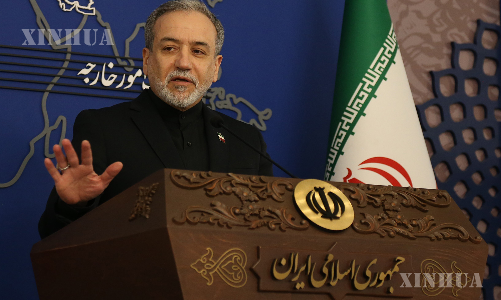 图说:3月16日,伊朗外交部长阿拉格齐在首都德黑兰出席伊朗外交部举行的每周例行记者会。新华社记者 沙达提 摄