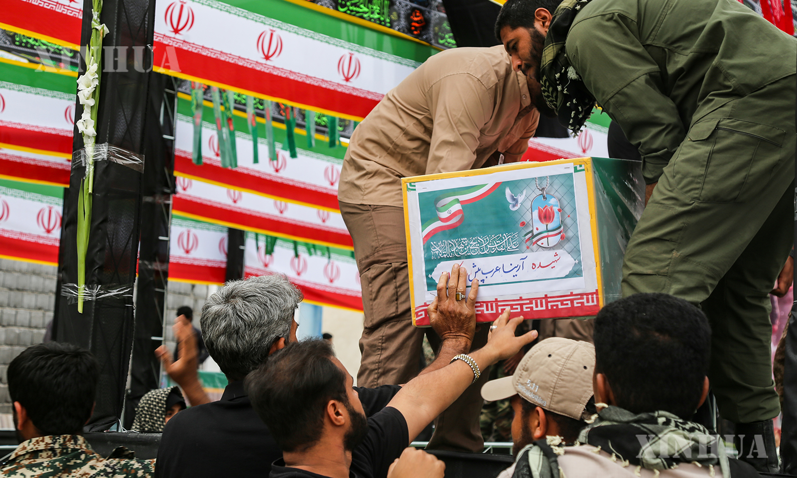အီရန်နိုင်ငံ တောင်ပိုင်း Minab မြို့တွင် အမေရိကန်-အစ္စရေးက မူလတန်းကျောင်းအား လေကြောင်းတိုက်ခိုက်မှုကြောင့် သေဆုံးခဲ့သူများအတွက် ဈာပနအခမ်းအနားကျင်းပနေသူများကို ၂၀၂၆ ခုနှစ် မတ် ၃ ရက်က တွေ့ရစဉ် (ဆင်ဟွာ)