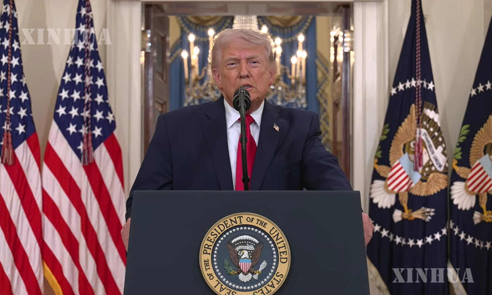 图说:这张视频截图显示,4月1日,美国总统特朗普在首都华盛顿白宫发表讲话。 新华社发
