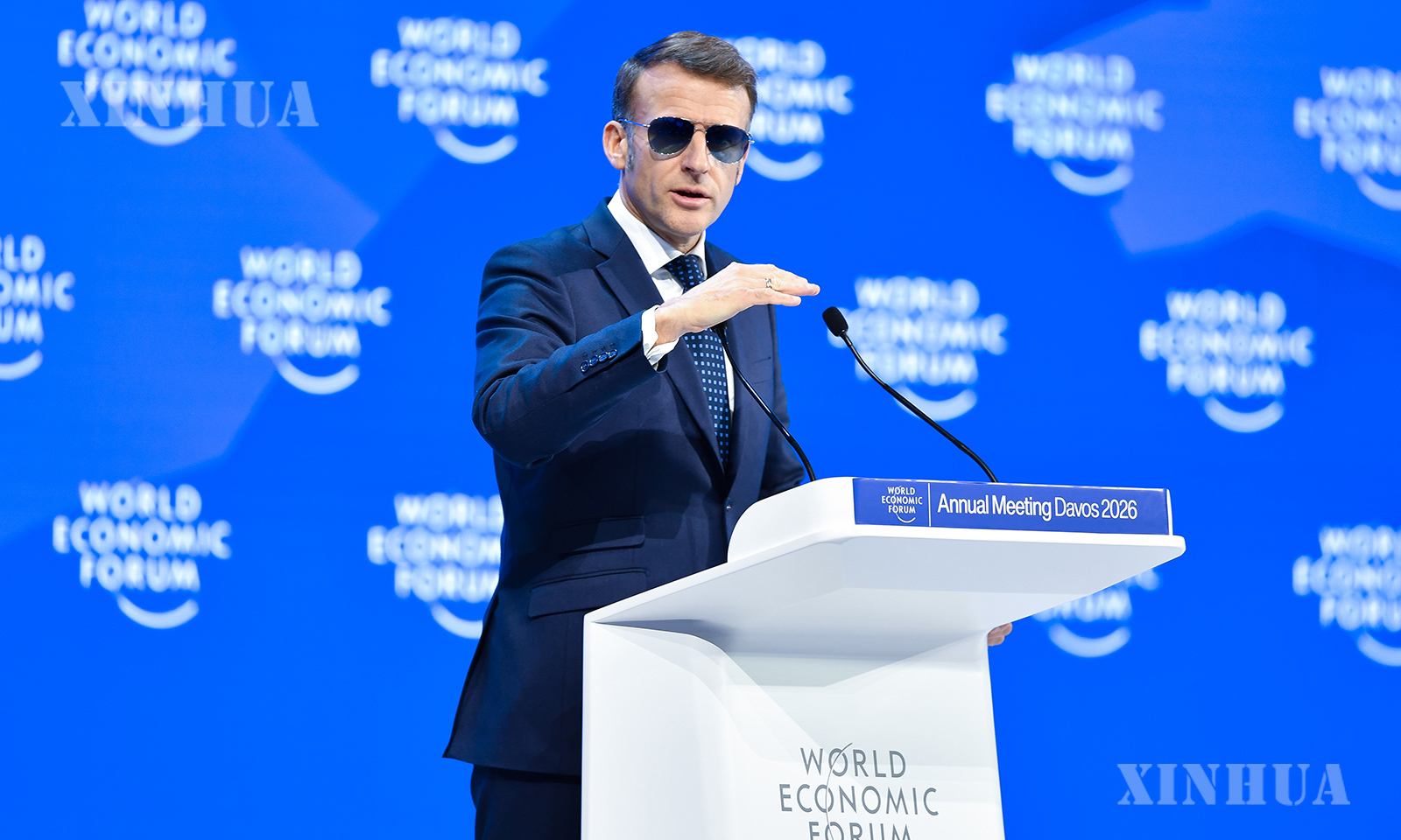 图说:1月20日,法国总统马克龙在瑞士达沃斯举办的世界经济论坛2026年年会上讲话。新华社记者 连漪 摄