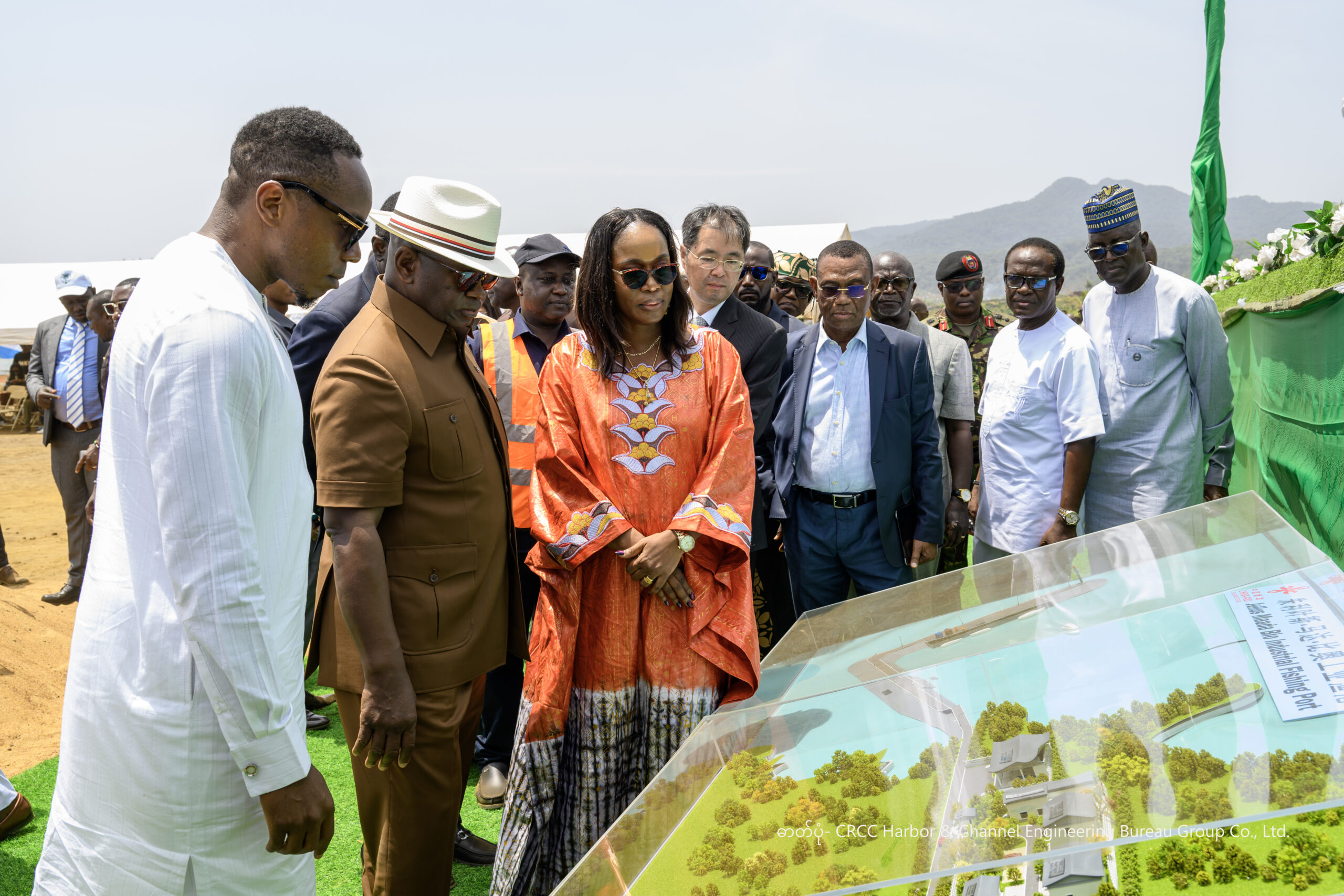 图说:4月23日,在塞拉利昂西部地区布莱克·约翰逊村,塞拉利昂总统比奥(左二)在中国援建的塞拉利昂渔码头项目海上工程启动仪式上参观项目沙盘模型。新华社发(中国铁建港航局集团有限公司供图)