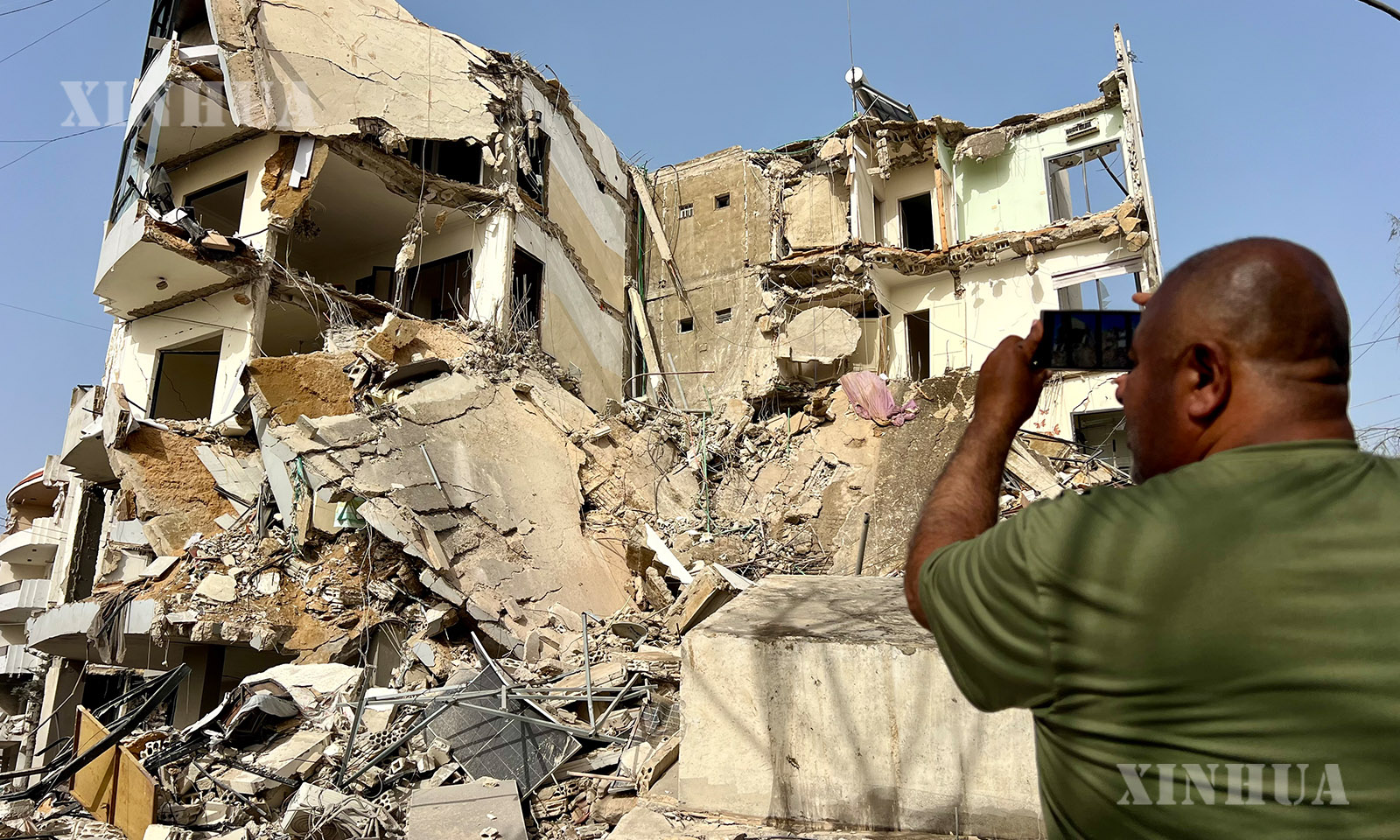 图说:4月4日,在黎巴嫩提尔,一名男子用手机拍摄遭以色列空袭损毁的建筑。新华社发(阿里·哈希绍摄)