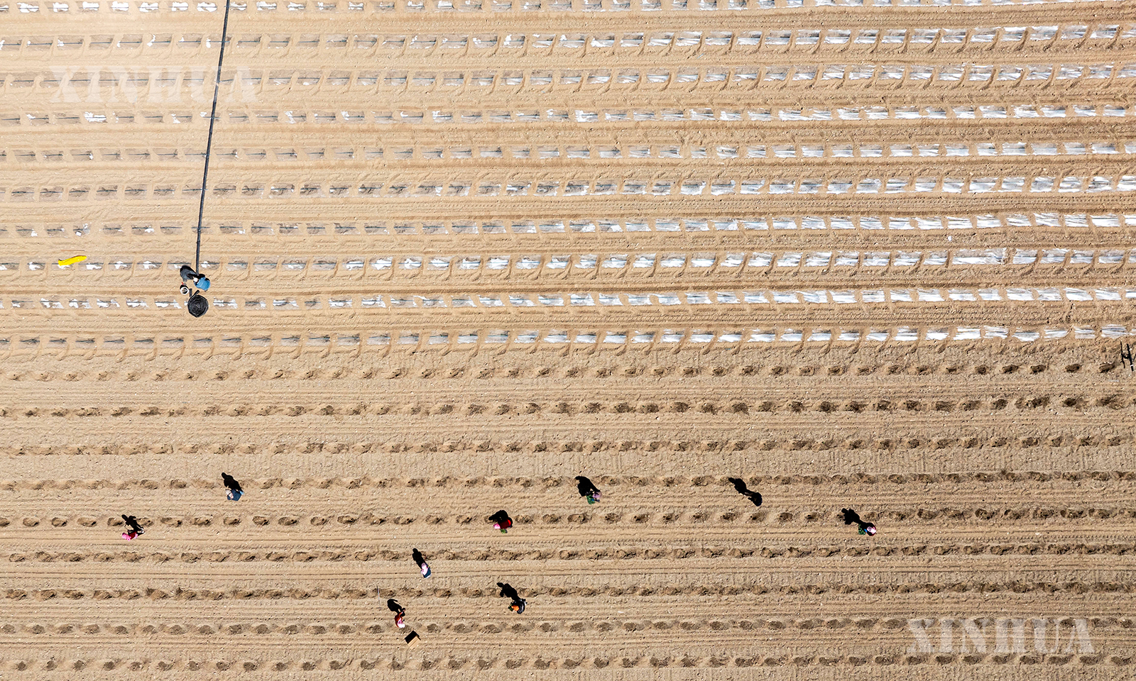 图说:4月6日,宁夏中卫市沙坡头区兴仁镇,农户在田间种植硒砂瓜种苗。 新华社记者 王鹏 摄