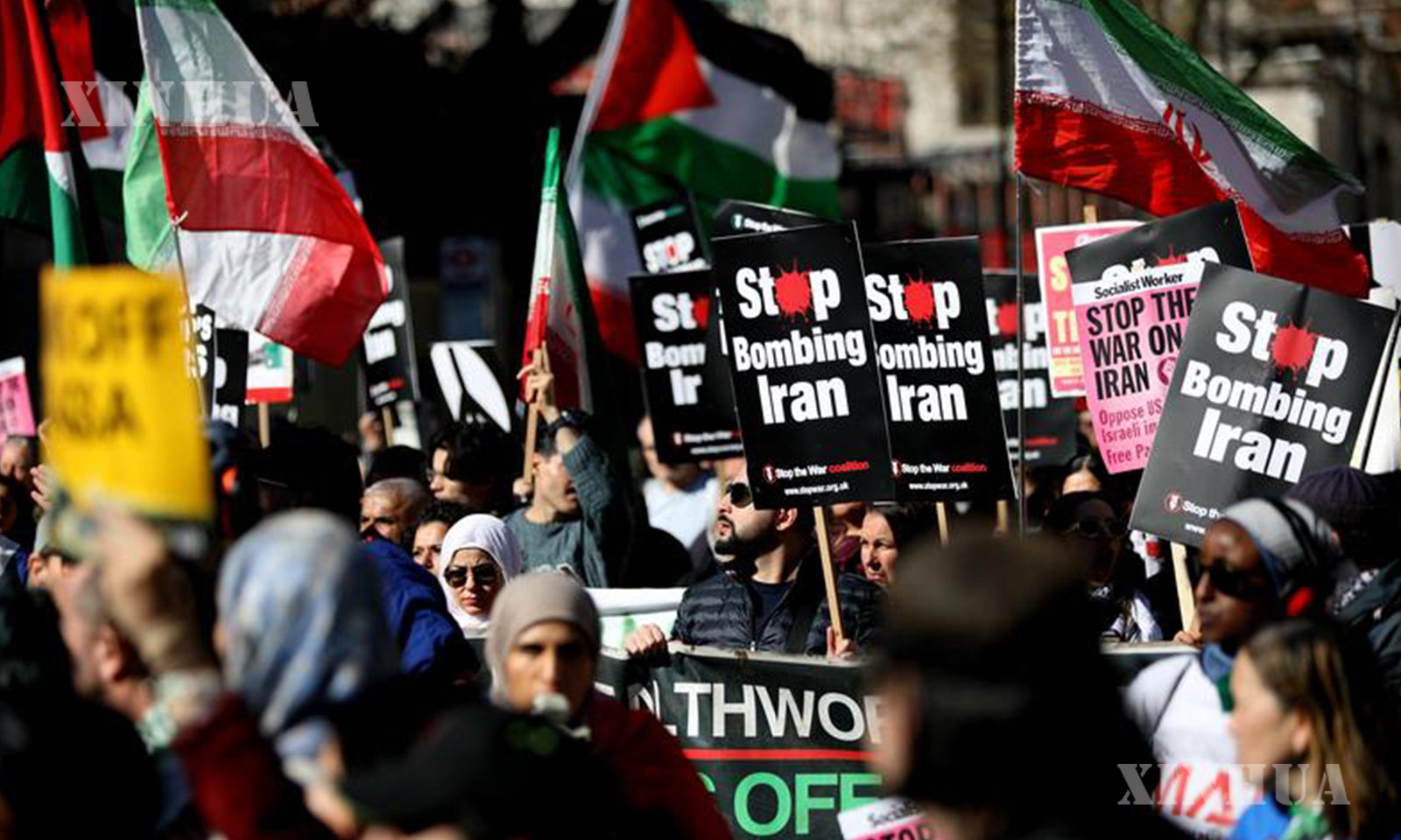 အီရန်အပေါ် အမေရိကန်နှင့် အစ္စရေး စစ်ရေးတိုက်ခိုက်မှုအား ဆန့်ကျင်ဆန္ဒပြနေသူများကို ဗြိတိန်နိုင်ငံ လန်ဒန်မြို့တွင် ၂၀၂၆ ခုနှစ် မတ် ၂၁ ရက်က တွေ့ရစဉ် (ဆင်ဟွာ)