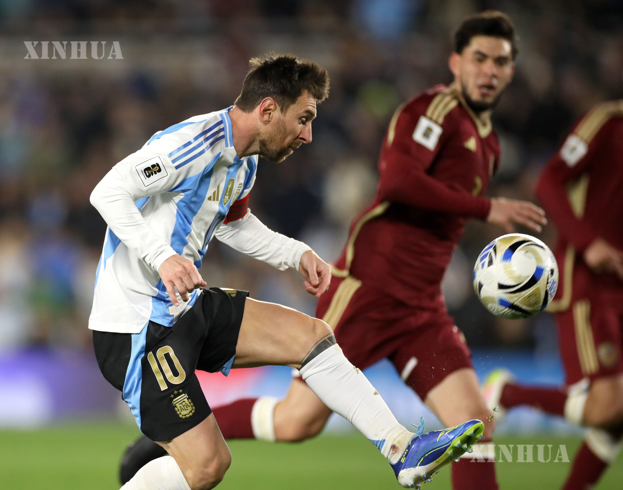 အာဂျင်တီးနားနိုင်ငံ ဗျူနိုအေးရိစ်မြို့တွင် ၂၀၂၅ ခုနှစ် စက်တင်ဘာ ၄ ရက်က အာဂျင်တီးနားအသင်းနှင့် ဗင်နီဇွဲလားအသင်းတို့ ယှဉ်ပြိုင်ကစားခဲ့သည့် ၂၀၂၆ ခုနှစ် ဖီဖာကမ္ဘာ့ဖလားပြိုင်ပွဲ တောင်အမေရိကဇုန် ခြေစစ်ပွဲစဉ်၌ အာဂျင်တီးနားကစားသမား လီယွန်နယ် မက်ဆီ ဘောလုံးထိန်းရန် ကြိုးပမ်းနေစဉ် (ဆင်ဟွာ)
