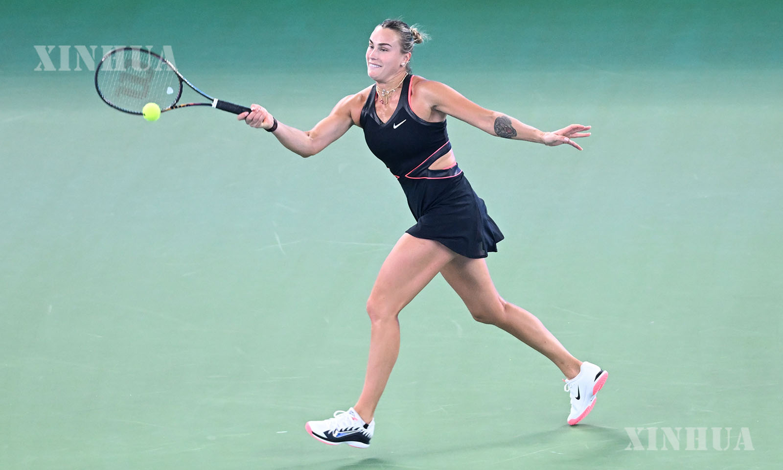တရုတ်နိုင်ငံ အလယ်ပိုင်း ဟူပေပြည်နယ် ဝူဟန့်မြို့၌ ကျင်းပသည့် ၂၀၂၅ ခုနှစ် ဝူဟန့်အိုးပင်း တင်းနစ်ပြိုင်ပွဲ အမျိုးသမီးတစ်ဦးချင်း ၁၆ ဦးအဆင့် ပွဲစဉ်အဖြစ် ရုရှားတင်းနစ်မယ် လျူဒီမီလာ ဆမ်ဆိုနိုဗာနှင့် ယှဉ်ပြိုင်စဉ် စပေးဘောအား တုံ့ပြန်နေသည့် ဘီလာရုစ်တင်းနစ်မယ် အရီနာ ဆာဘလန်ကာအား ၂၀၂၅ ခုနှစ် အောက်တိုဘာ ၉ ရက်က တွေ့ရစဉ် (ဆင်ဟွာ)