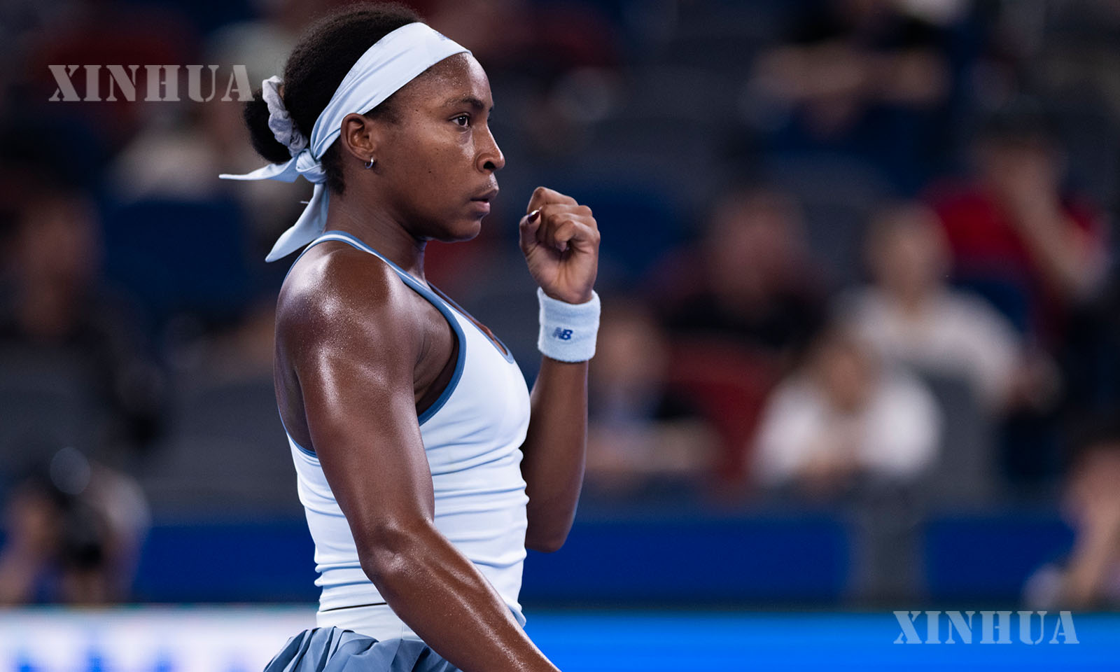 တရုတ်နိုင်ငံ အလယ်ပိုင်း ဟူပေပြည်နယ် ဝူဟန့်မြို့၌ ကျင်းပသည့် ၂၀၂၅ ခုနှစ် ဝူဟန့်အိုးပင်း တင်းနစ်ပြိုင်ပွဲ အမျိုးသမီးတစ်ဦးချင်း ၁၆ ဦးအဆင့် ပွဲစဉ်အဖြစ် တရုတ်တင်းနစ်မယ် ကျန်းစွိုက်နှင့် ယှဉ်ပြိုင်စဉ် ရမှတ်ရယူနိုင်ပြီးနောက် အောင်ပွဲခံနေသည့် အမေရိကန်တင်းနစ်မယ် ကိုကိုဂတ်ဖ်အား ၂၀၂၅ ခုနှစ် အောက်တိုဘာ ၉ ရက်က တွေ့ရစဉ် (ဆင်ဟွာ)