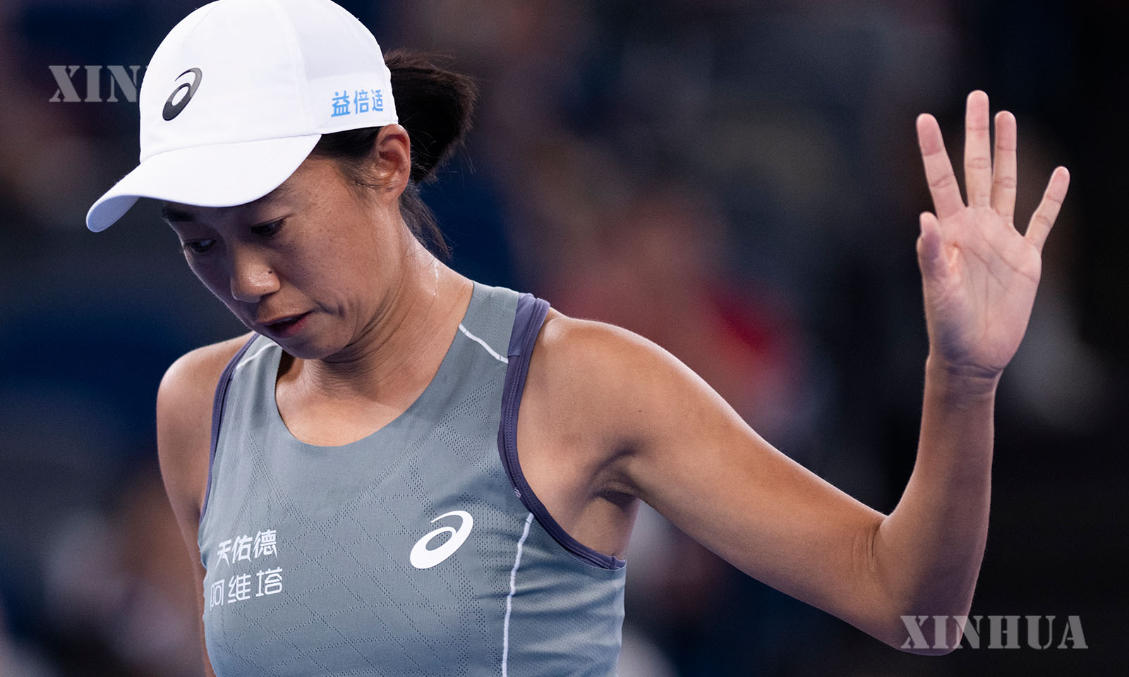 Zhang Shuai of China reacts during the women’s singles round of 16 match against Coco Gauff of the United States at the 2025 Wuhan Open tennis tournament in Wuhan, central China’s Hubei Province, Oct. 9, 2025. (Xinhua/Wu Zhizun)