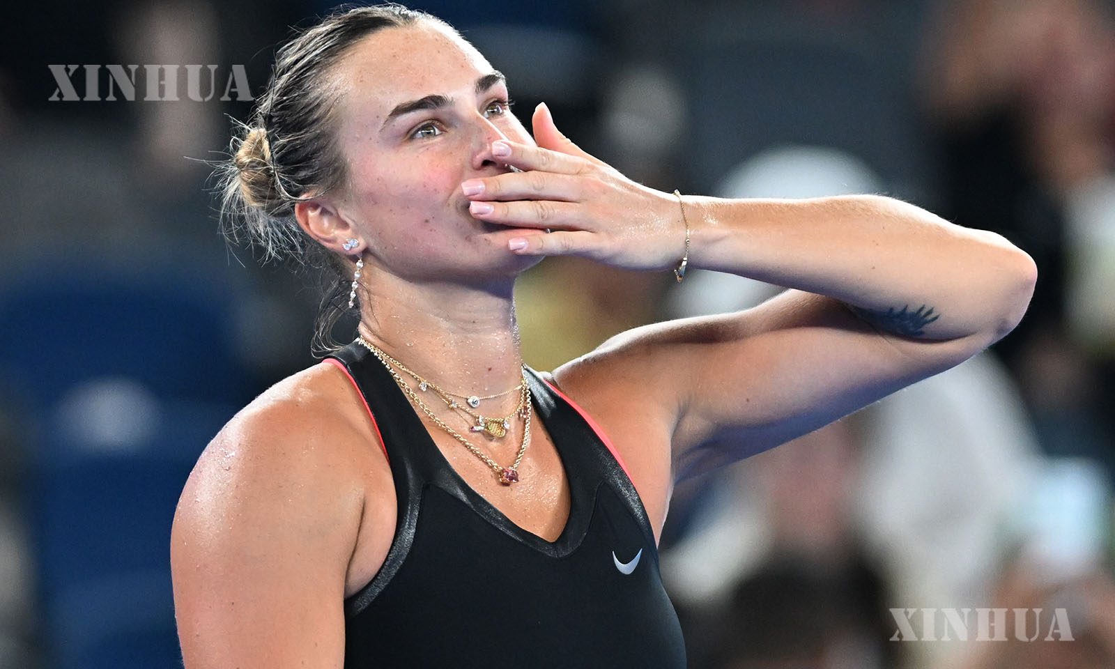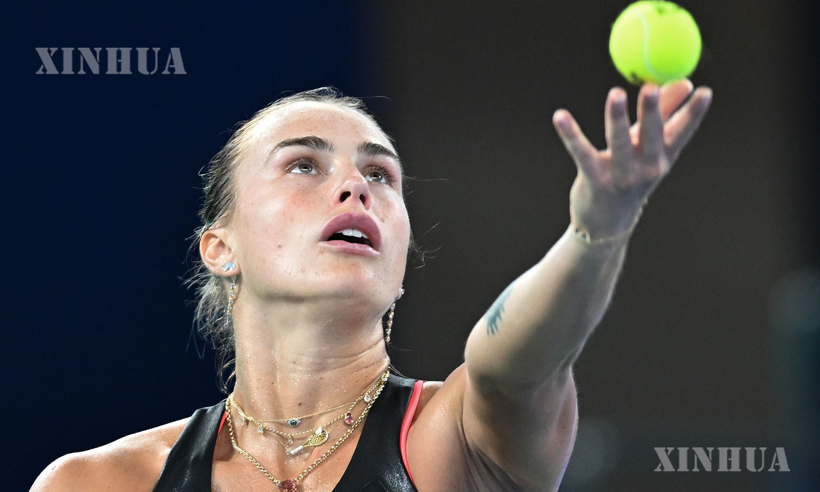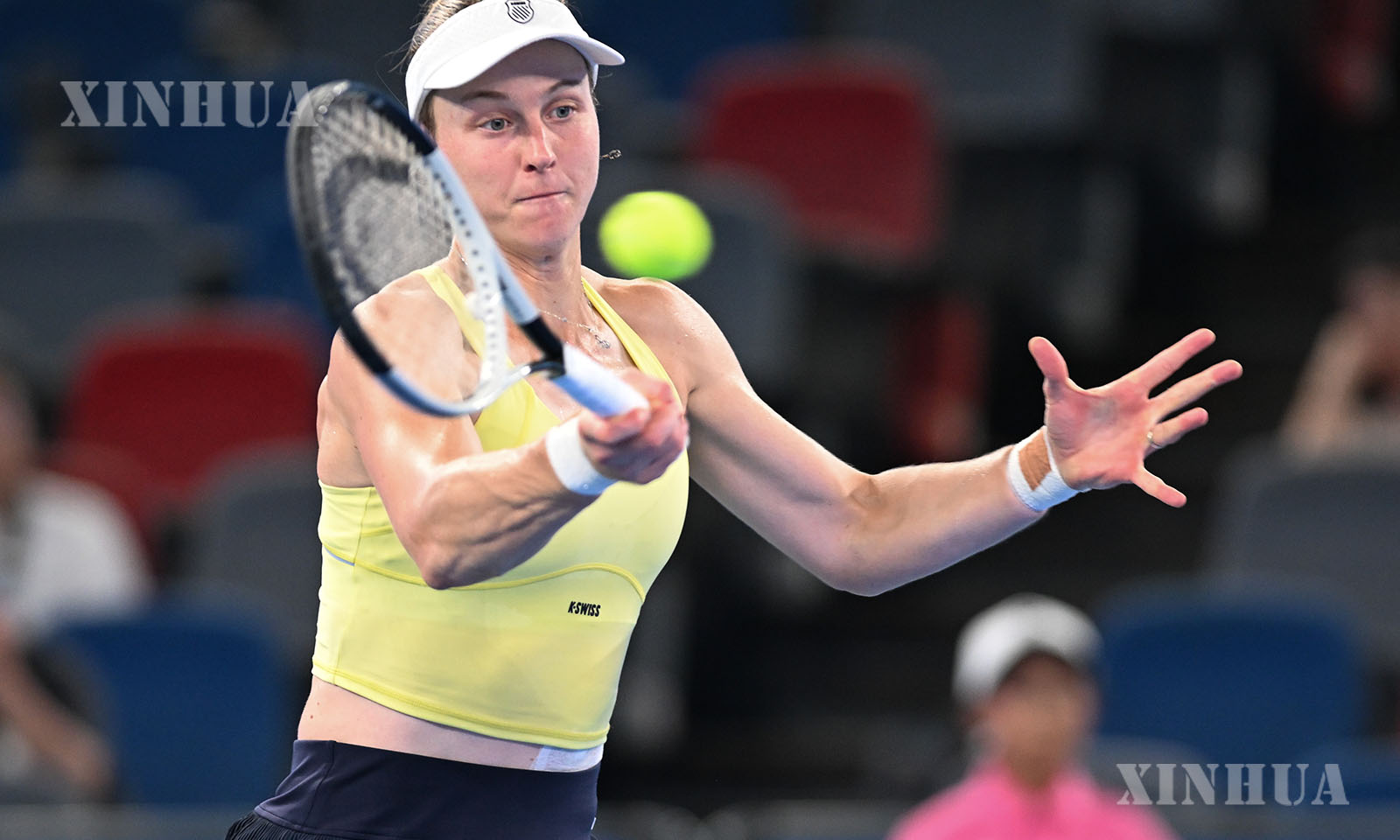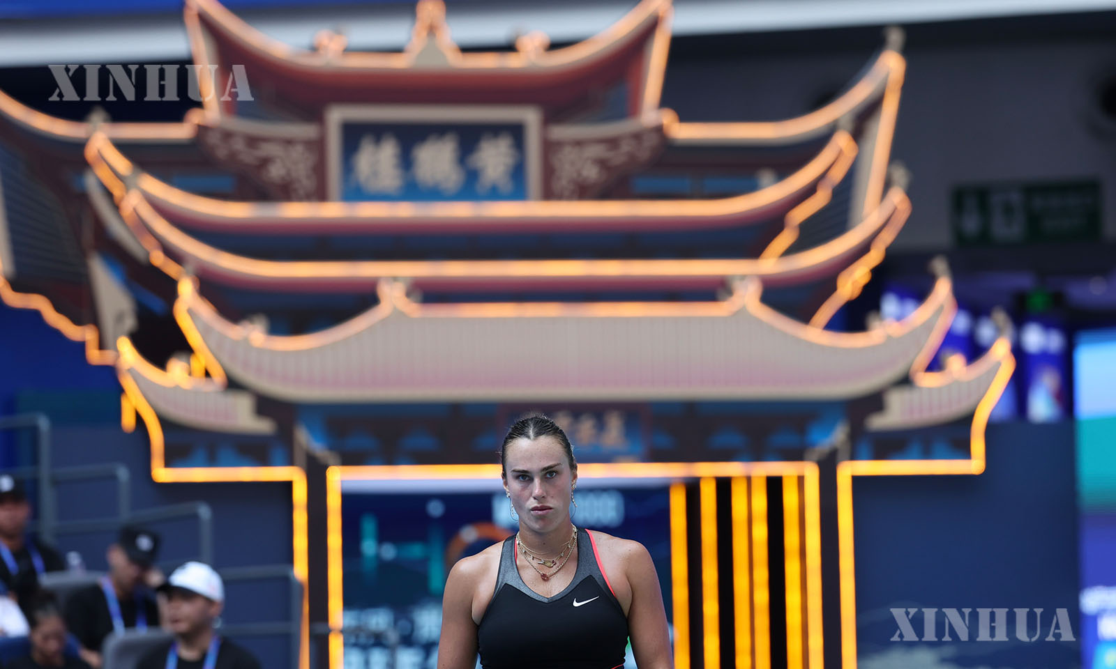 တရုတ်နိုင်ငံ အလယ်ပိုင်း ဟူပေပြည်နယ် ဝူဟန့်မြို့၌ ကျင်းပသည့် ၂၀၂၅ ခုနှစ် ဝူဟန့်အိုးပင်း တင်းနစ်ပြိုင်ပွဲ အမျိုးသမီးတစ်ဦးချင်း ၁၆ ဦးအဆင့် ပွဲစဉ်အဖြစ် ရုရှားတင်းနစ်မယ် လျူဒီမီလာ ဆမ်ဆိုနိုဗာနှင့် ယှဉ်ပြိုင်စဉ် စပေးဘောအား တုံ့ပြန်နေသည့် ဘီလာရုစ်တင်းနစ်မယ် အရီနာ ဆာဘလန်ကာအား ၂၀၂၅ ခုနှစ် အောက်တိုဘာ ၉ ရက်က တွေ့ရစဉ် (ဆင်ဟွာ)