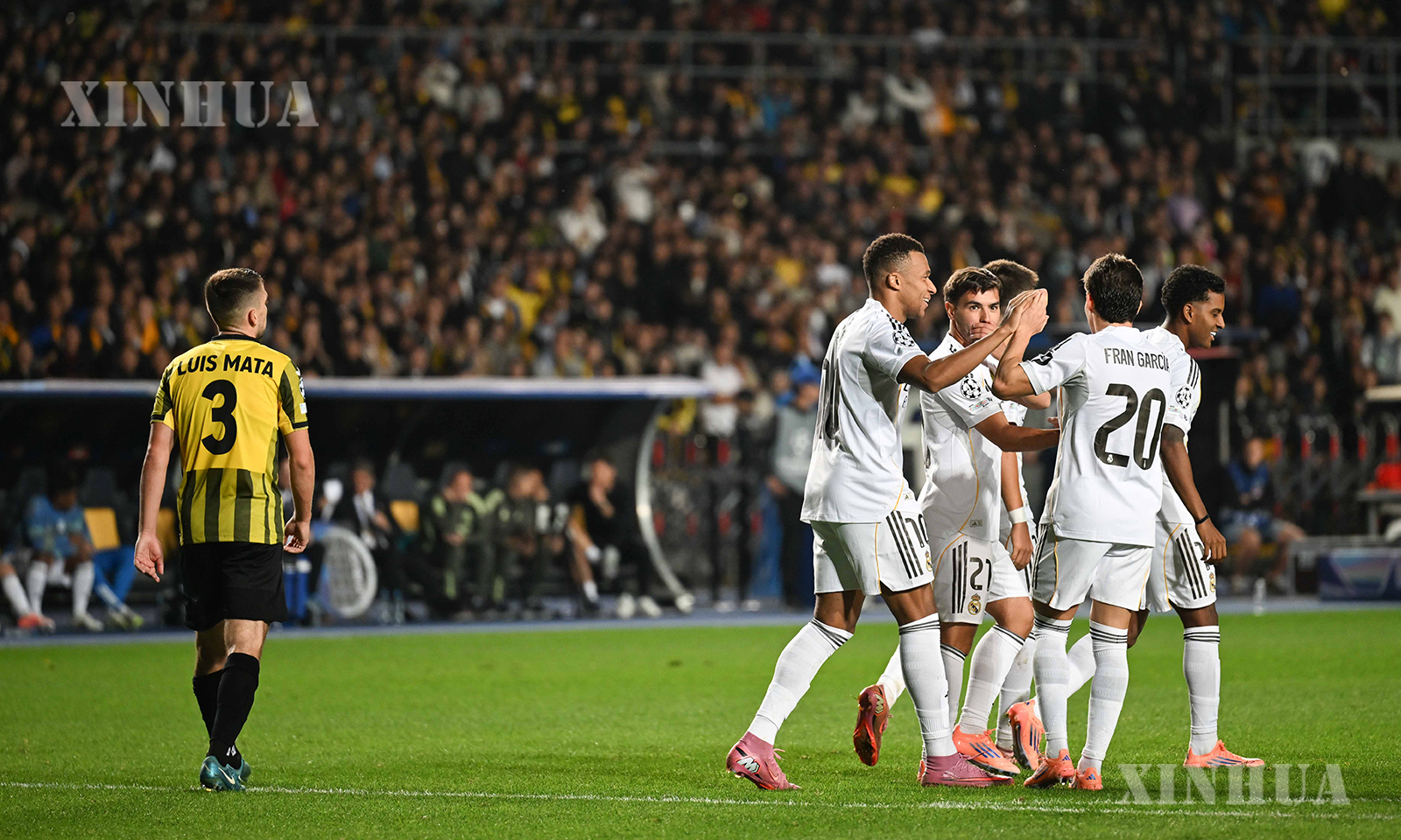 ကာဇက်စတန်နိုင်ငံ အယ်လ်မာတီမြို့တွင် ၂၀၂၅ ခုနှစ် စက်တင်ဘာ ၃၀ ရက်က ကိုင်ရတ် အယ်လ်မာတီနှင့် ရီးရဲလ်မက်ဒရစ်တို့ ယှဉ်ပြိုင်ကစားခဲ့သည့် ယူအီးအက်ဖ်အေ ချန်ပီယံလိဂ်ပွဲစဉ်၌ ရီးရဲလ်မက်ဒရစ် ကစားသမားများ ဂိုးသွင်းပြီးနောက် အောင်ပွဲခံနေပုံကို တွေ့ရစဉ် (ဆင်ဟွာ)
