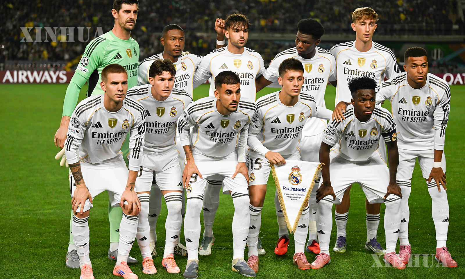 ကာဇက်စတန်နိုင်ငံ အယ်လ်မာတီမြို့တွင် ၂၀၂၅ ခုနှစ် စက်တင်ဘာ ၃၀ ရက်က ကိုင်ရတ် အယ်လ်မာတီနှင့် ရီးရဲလ်မက်ဒရစ်တို့ ယှဉ်ပြိုင်ကစားသည့် ယူအီးအက်ဖ်အေ ချန်ပီယံလိဂ်ပွဲစဉ်မတိုင်မီ ရီးရဲလ်မက်ဒရစ် ကစားသမားများ အသင်းလိုက်ဓာတ်ပုံရိုက်နေစဉ် (ဆင်ဟွာ)