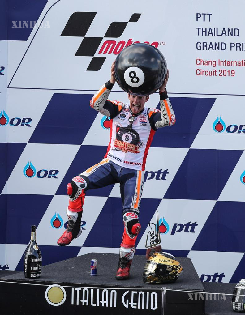 Marc Marquez of Repsol Honda Team celebrates his eighth world championship and sixth in the Premier Class at the MotoGP Thai Grand Prix in Buriram, Thailand, Oct. 6, 2019. (Xinhua/Zhang Keren)