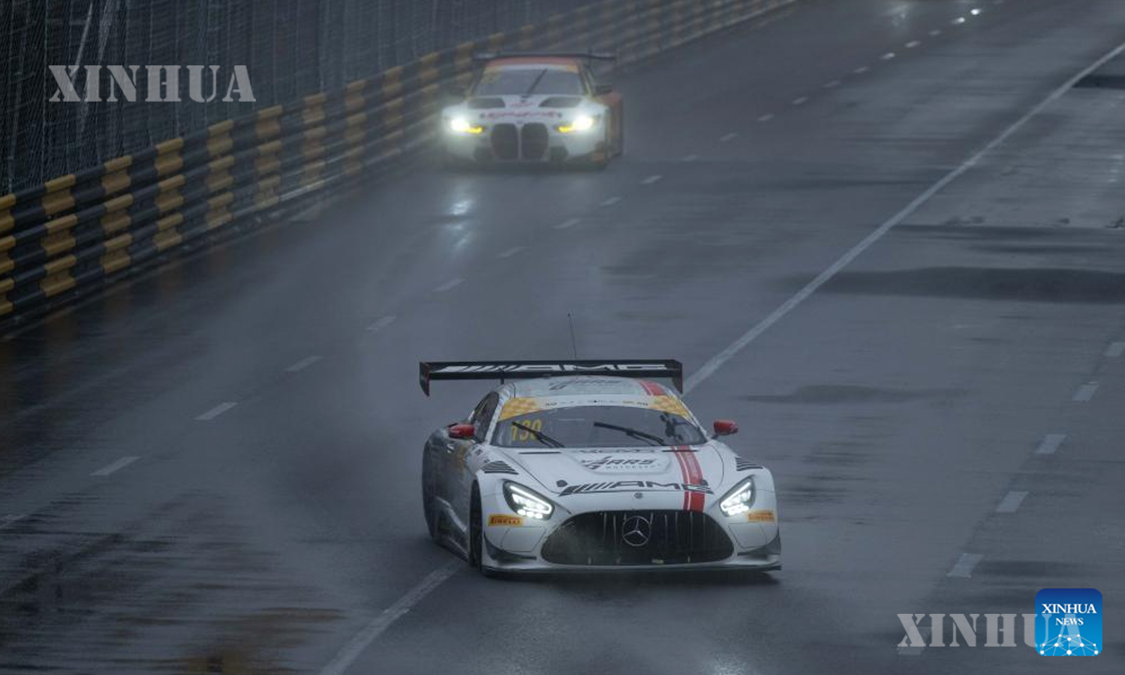 Photo : Maro Engel (front) of Germany drives during the Macao GT Cup-FIA GT World Cup race at the 71st Macao Grand Prix in Macao, south China, Nov. 17, 2024. (Xinhua/Cheong Kam Ka)