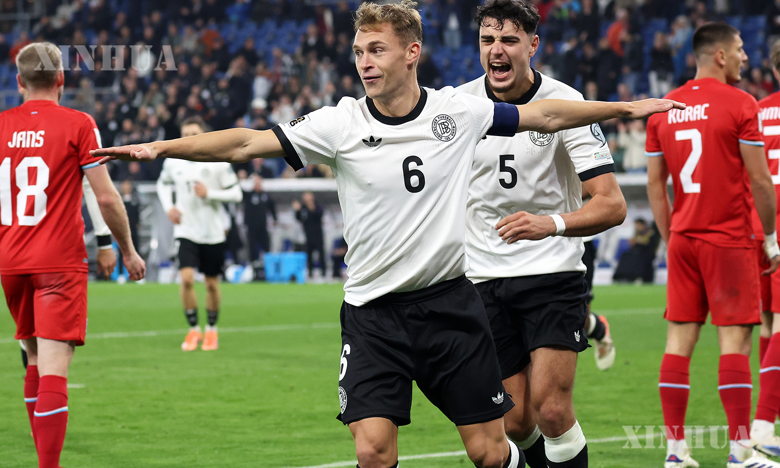ဂျာမနီနိုင်ငံ ဆင်န်ရှိုင်းမြို့တွင် ၂၀၂၅ ခုနှစ် အောက်တိုဘာ ၁၀ ရက်က ဂျာမနီအသင်းနှင့် လူဇင်ဘတ်အသင်းတို့ ယှဉ်ပြိုင်ကစားခဲ့သည့် ၂၀၂၆ ခုနှစ် ကမ္ဘာ့ဖလား ဥရောပဇုန်ခြေစစ်ပွဲစဉ်၌ ဂျာမနီအသင်းမှ ဂျိုရှူအာ ကင်းမစ်ချ် (ဝဲ-ဒုတိယ) နှင့် အလက်ဇန်းဒါး ပက်ဗ်‌လော့ဗစ် (ဝဲ-တတိယ) တို့ ဂိုးသွင်းပြီးနောက် အောင်ပွဲခံနေစဉ် (ဆင်ဟွာ)