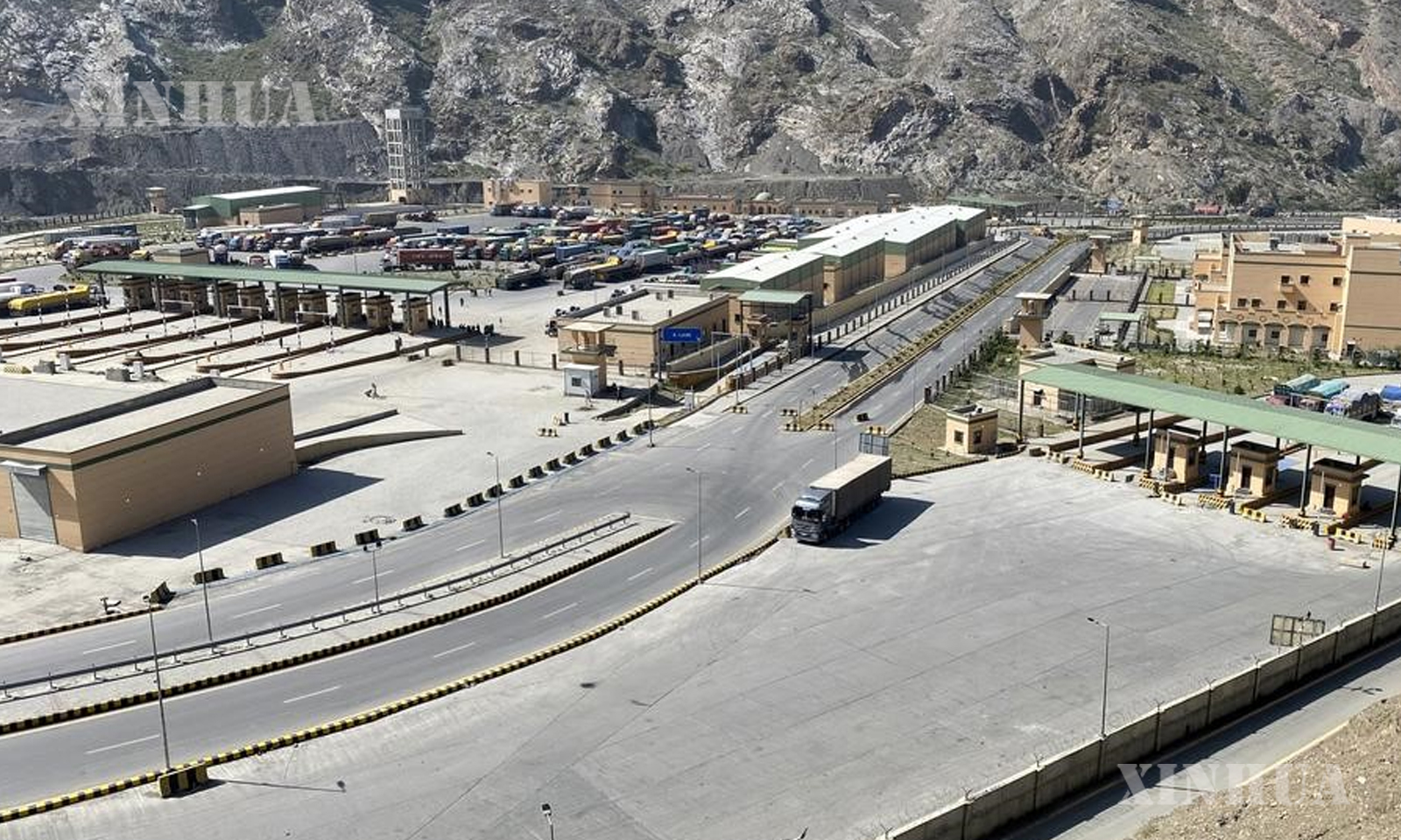 Photo : This photo taken on Oct. 13, 2025 shows trucks stalled at the Pakistan-Afghanistan Torkham border, amid cross-border clashes in northwest Pakistan’s Torkham. (Str/Xinhua)
