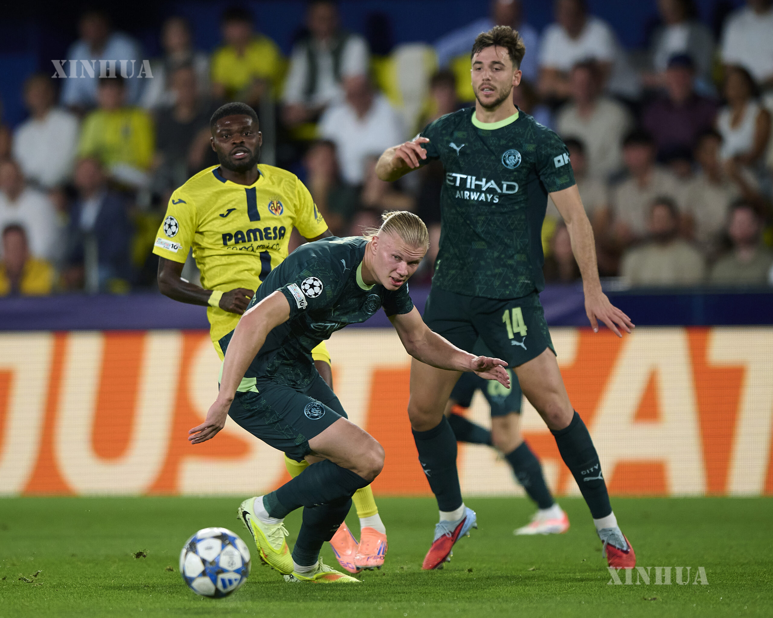 စပိန်နိုင်ငံ ဗီလာရီးရဲလ်မြို့ရှိ လာဆယ်ရာမီကာ အားကစားကွင်း၌ ၂၀၂၅ ခုနှစ် အောက်တိုဘာ ၂၁ ရက်က မန်ချက်စတာစီးတီးအသင်းနှင့် ဗီလာရီးရဲလ်အသင်းတို့ ယှဉ်ပြိုင်ကစားခဲ့သည့် ချန်ပီယံလိဂ်ပွဲစဉ်၌ မန်ချက်စတာစီးတီးအသင်းမှ အာလင် ဟာလန်း (ရှေ့) ထိုးဖောက်ကစားနေပုံကို တွေ့ရစဉ် (ဆင်ဟွာ)