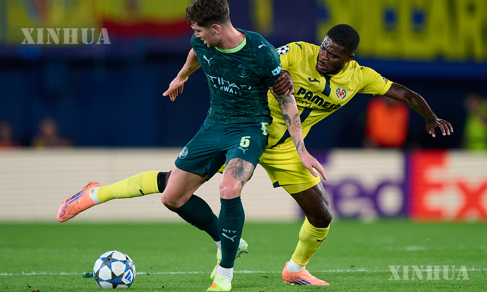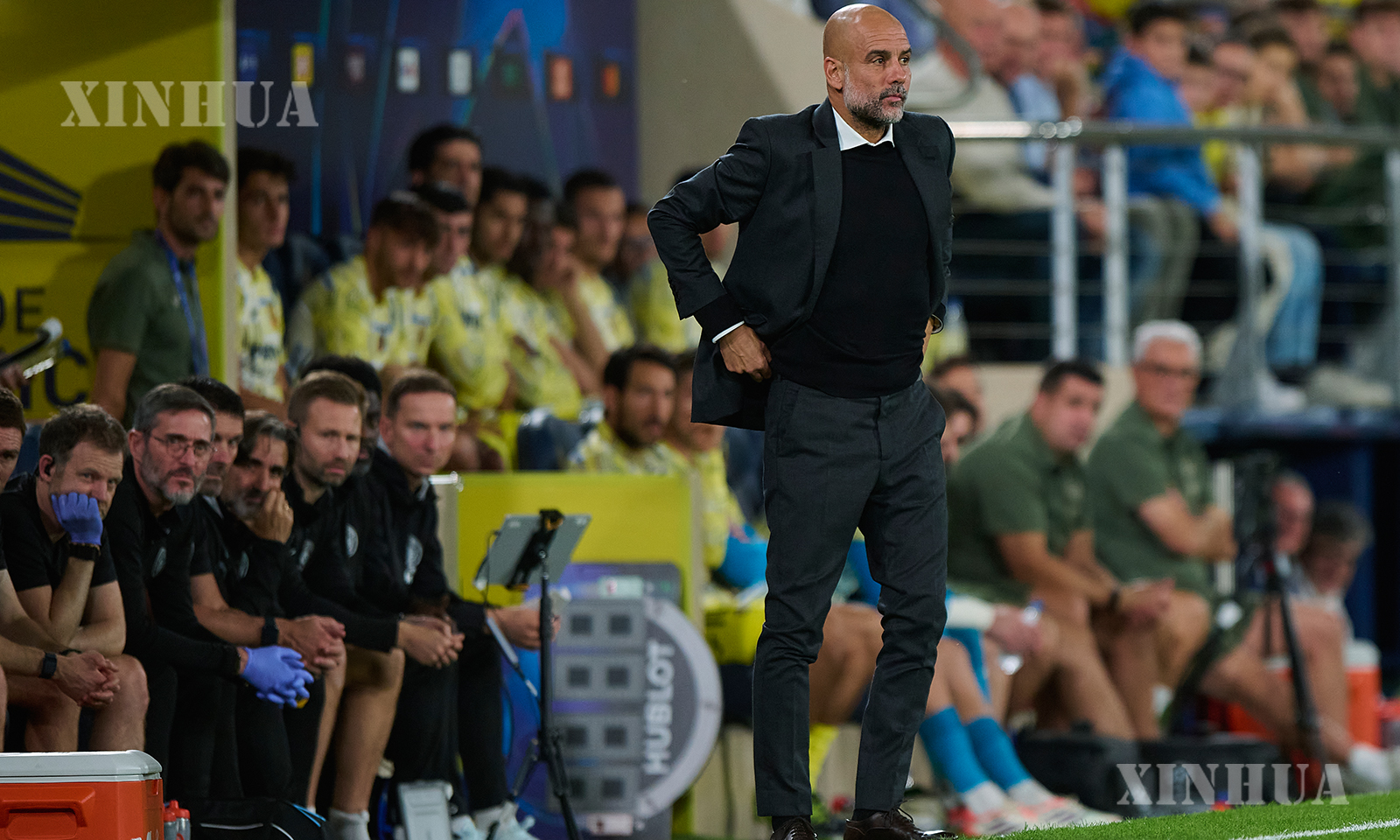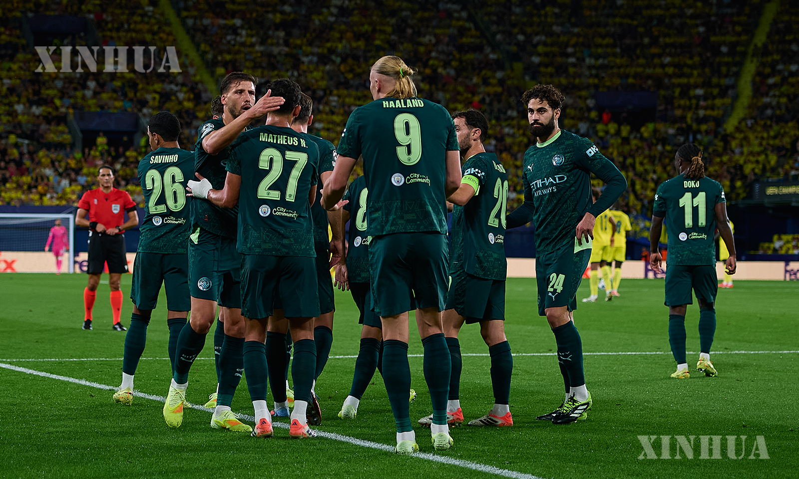 စပိန်နိုင်ငံ ဗီလာရီးရဲလ်မြို့ရှိ လာဆယ်ရာမီကာ အားကစားကွင်း၌ ၂၀၂၅ ခုနှစ် အောက်တိုဘာ ၂၁ ရက်က မန်ချက်စတာစီးတီးအသင်းနှင့် ဗီလာရီးရဲလ်အသင်းတို့ ယှဉ်ပြိုင်ကစားခဲ့သည့် ချန်ပီယံလိဂ်ပွဲစဉ်၌ မန်ချက်စတာစီးတီးအသင်းသားများ ဂိုးသွင်းပြီးနောက် အောင်ပွဲခံနေစဉ် (ဆင်ဟွာ)