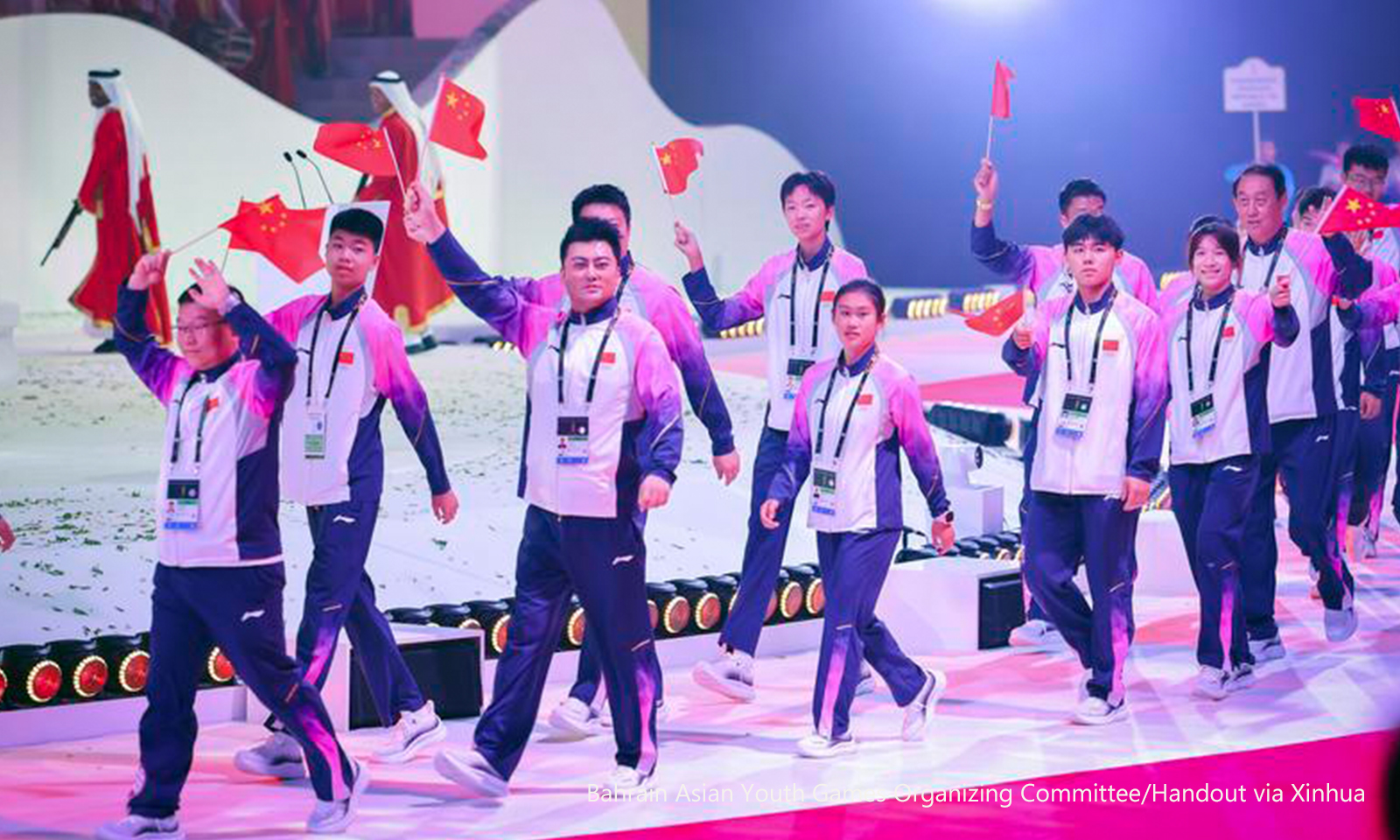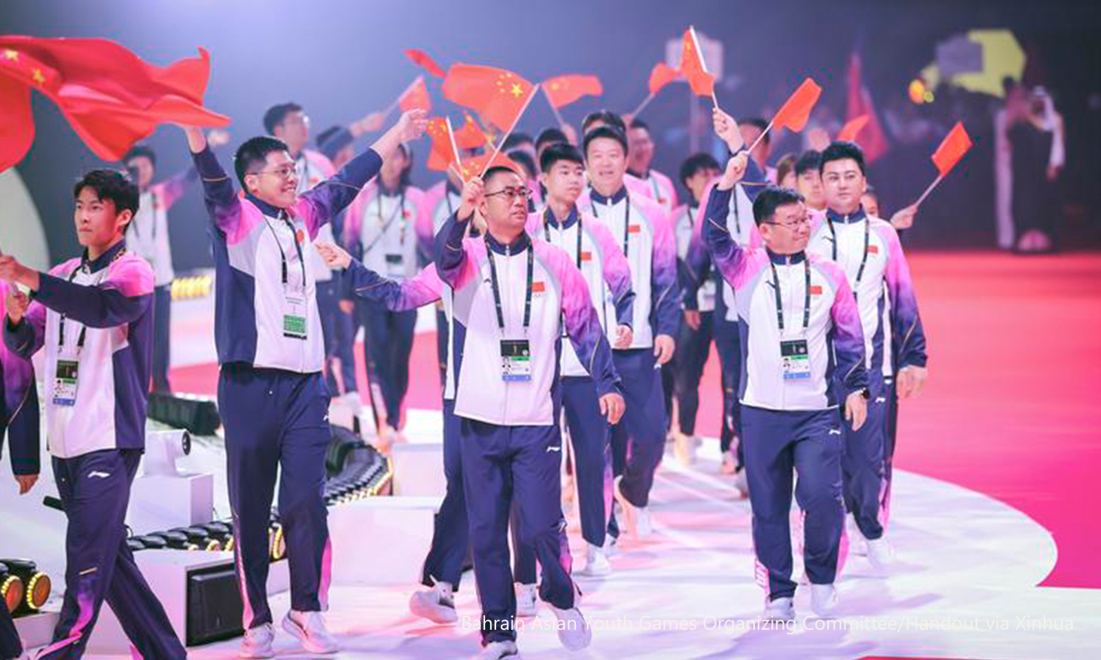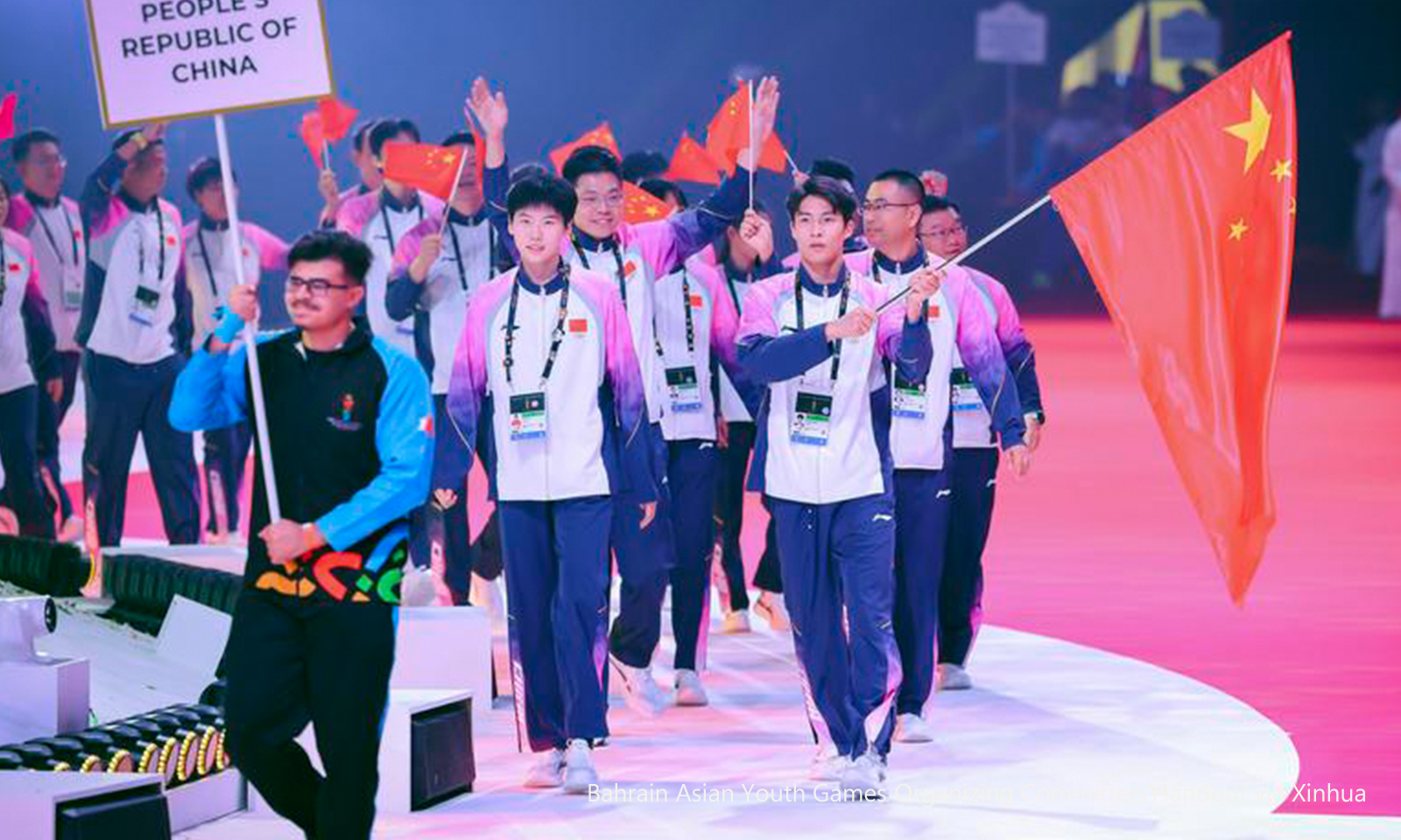 တတိယအကြိမ်မြောက် အာရှလူငယ်အားကစားပွဲ ဖွင့်ပွဲအခမ်းအနားကို Exhibition World Bahrain ၌ ကျင်းပရာ တရုတ်ကိုယ်စားလှယ်အဖွဲ့ ဝင်ရောက်လာသည်ကို ၂၀၂၅ ခုနှစ် အောက်တိုဘာ ၂၂ ရက်က တွေ့ရစဉ် (ဓာတ်ပုံ- Bahrain Asian Youth Games Organizing Committee/Handout via Xinhua)