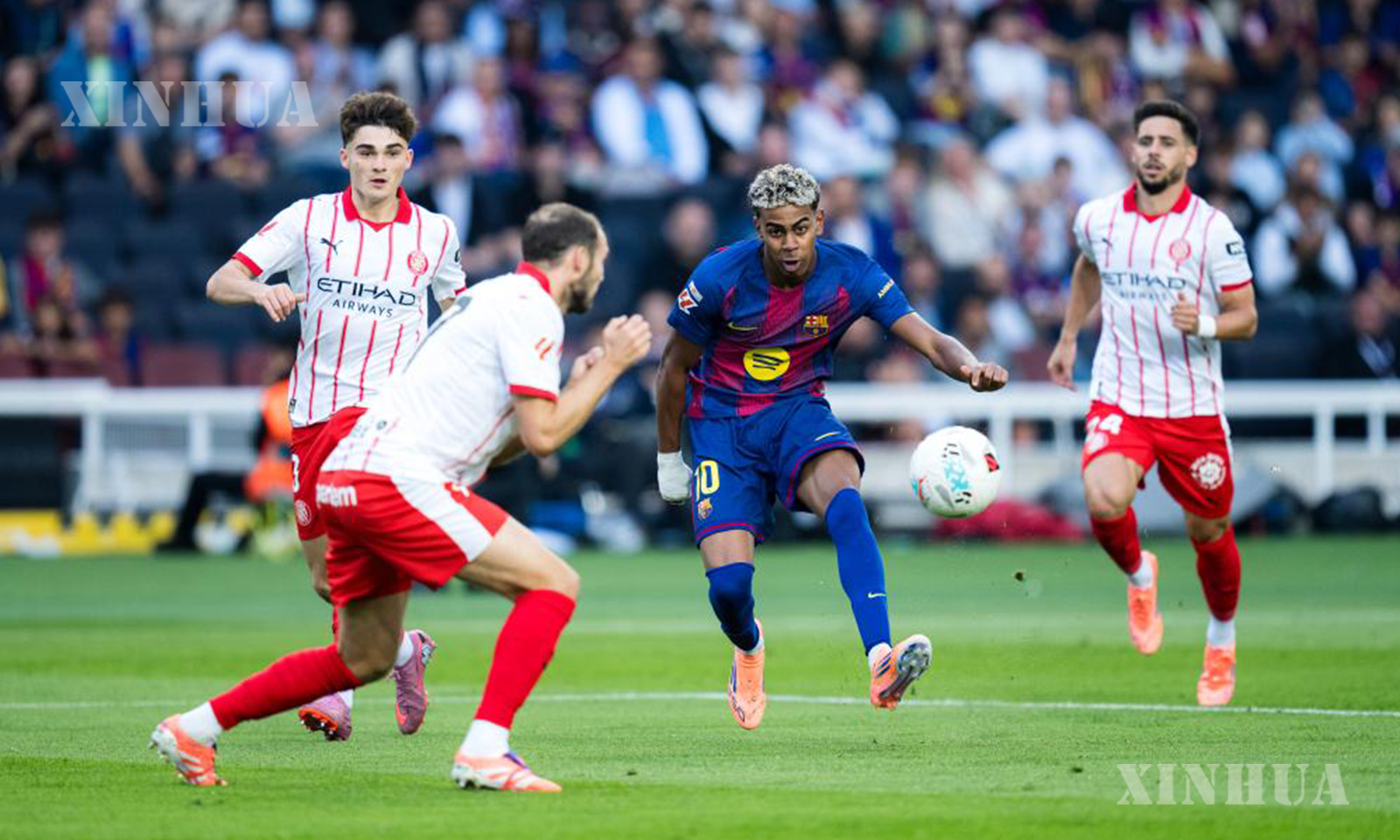 Lamine Yamal (2nd R) of Barcelona shoots during the match. (Photo by Joan Gosa/Xinhua)