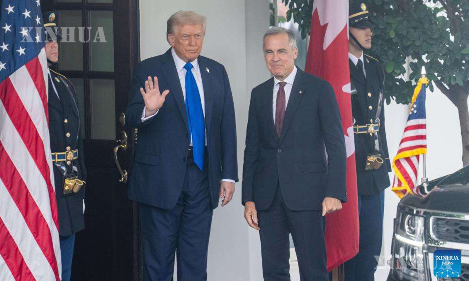 U.S. President Donald Trump (2nd L) welcomes Canadian Prime Minister Mark Carney (2nd R) at the White House in Washington, D.C., the United States, on Oct. 7, 2025. (Xinhua/Hu Yousong)