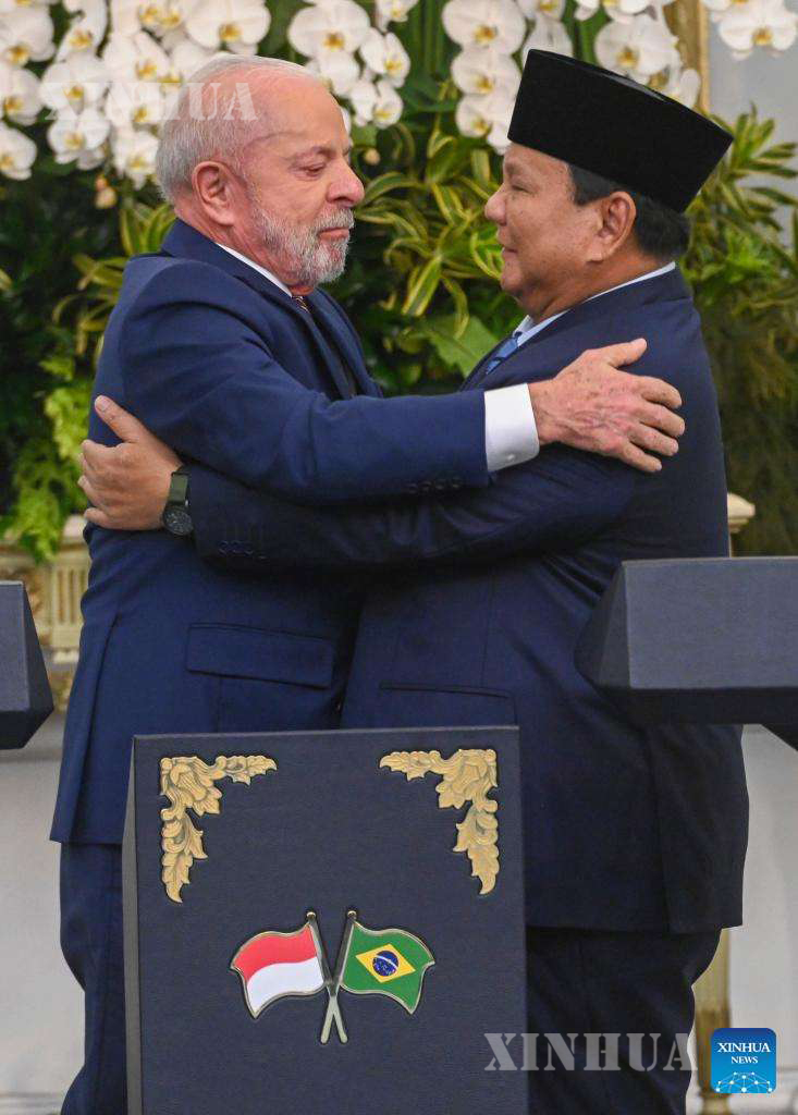 Indonesian President Prabowo Subianto (R) and Brazilian President Luiz Inacio Lula da Silva attend a joint press conference at Merdeka Palace in Jakarta, Indonesia, Oct. 23, 2025. (Photo by Zulkarnain/Xinhua)